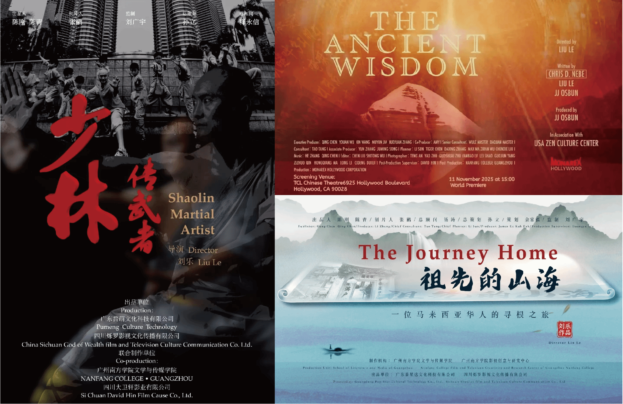 近年来,中心师生积极参与国内外影像创作与学术实践项目,主持和参与国家级课题《中国节日影像志》子课题——纪录片《行花街》的创作,在非物质文化遗产影像记录与城市文化传播方面形成了具有代表性的成果。同时,中心创作推出“中马人文影像交流系列纪录片”三部曲,其中《少林传武者》《祖先的山海》在马来西亚上映并开展巡展,获得《人民日报》《新华社》《光明日报》等中外主流媒体的广泛关注与肯定。2025年,中心与美国好莱坞 MONAREX 公司合作,完成纪录电影《THE ANCIENT WISDOM》(《古老智慧》),该片在好莱坞中国戏院首映,以国际化影像语言呈现中华文明“古老智慧”的当代价值。