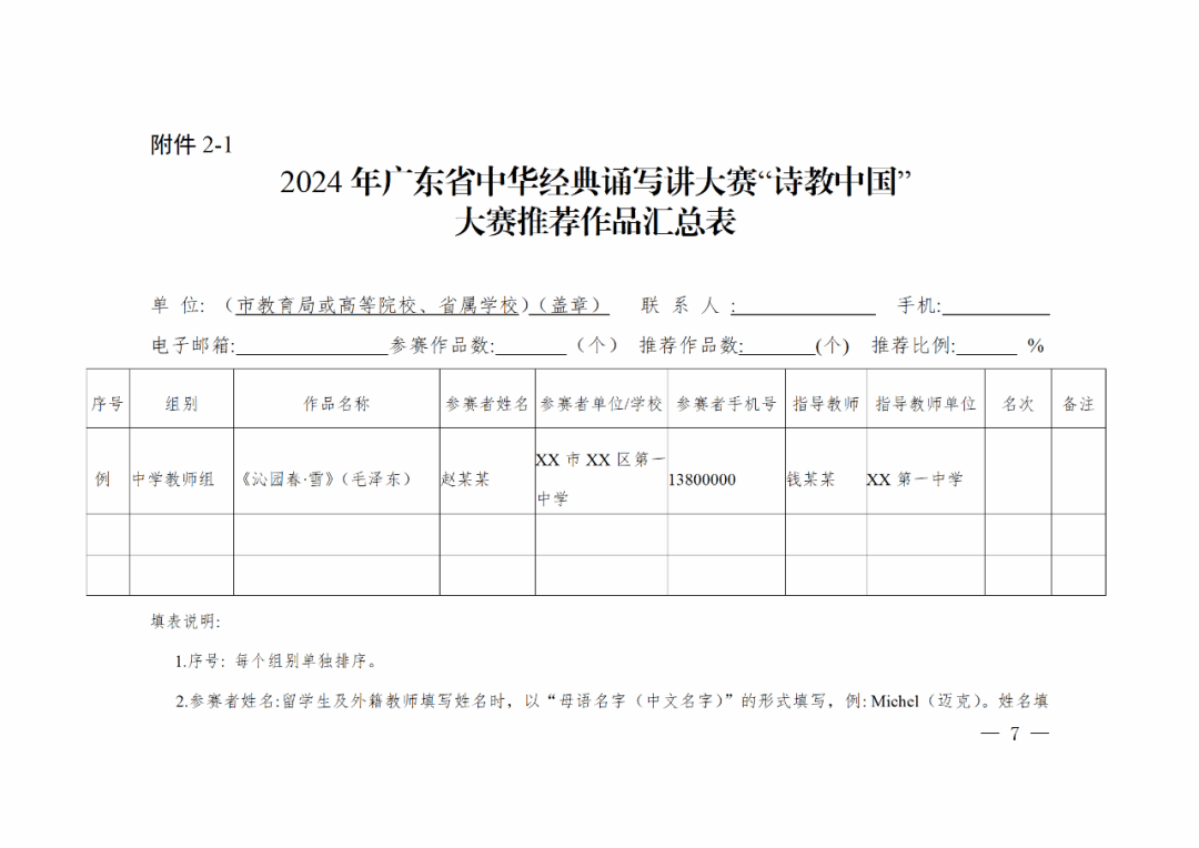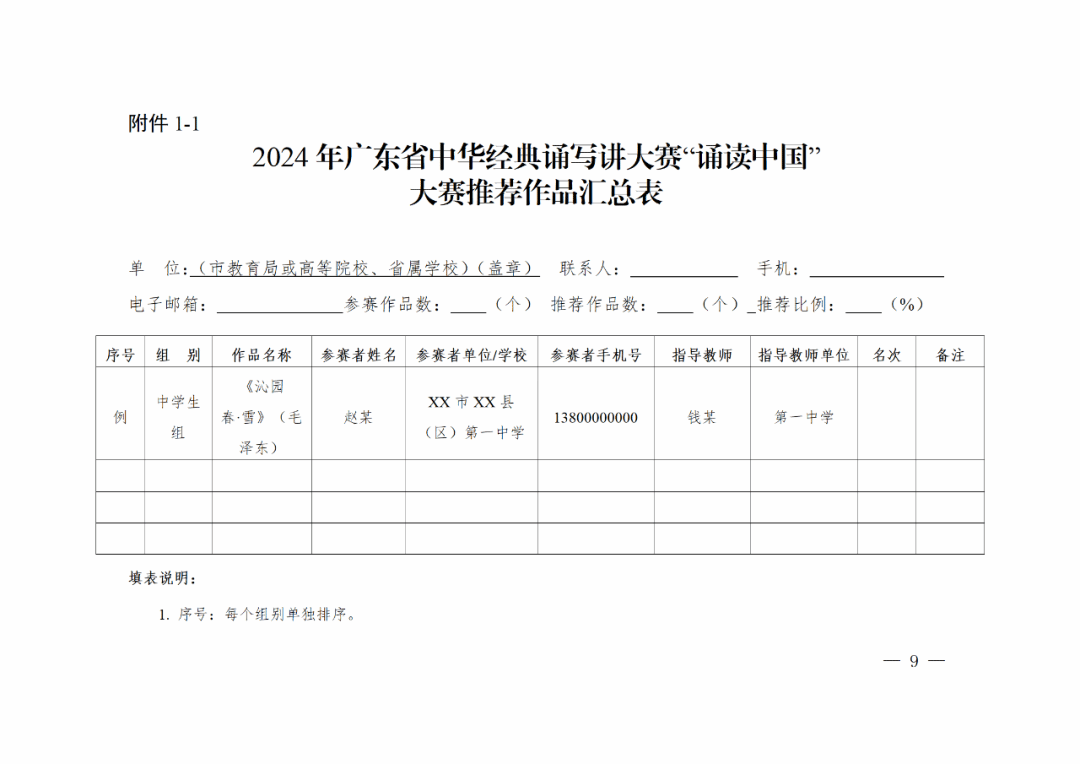1.2024年广东省中华经典诵写讲大赛“诵读中国”大赛推荐作品汇总表(见附件1-1)。请同时将该汇总表的EXCEL表格以及盖有公章的PDF电子扫描件合并为一个文件夹,发送至大赛指定邮箱1132159792@qq.com。邮件标题及文件夹(包括每个文件)统一命名格式为“报送单位+2024年广东省‘诵读中国’大赛推荐作品汇总表”。