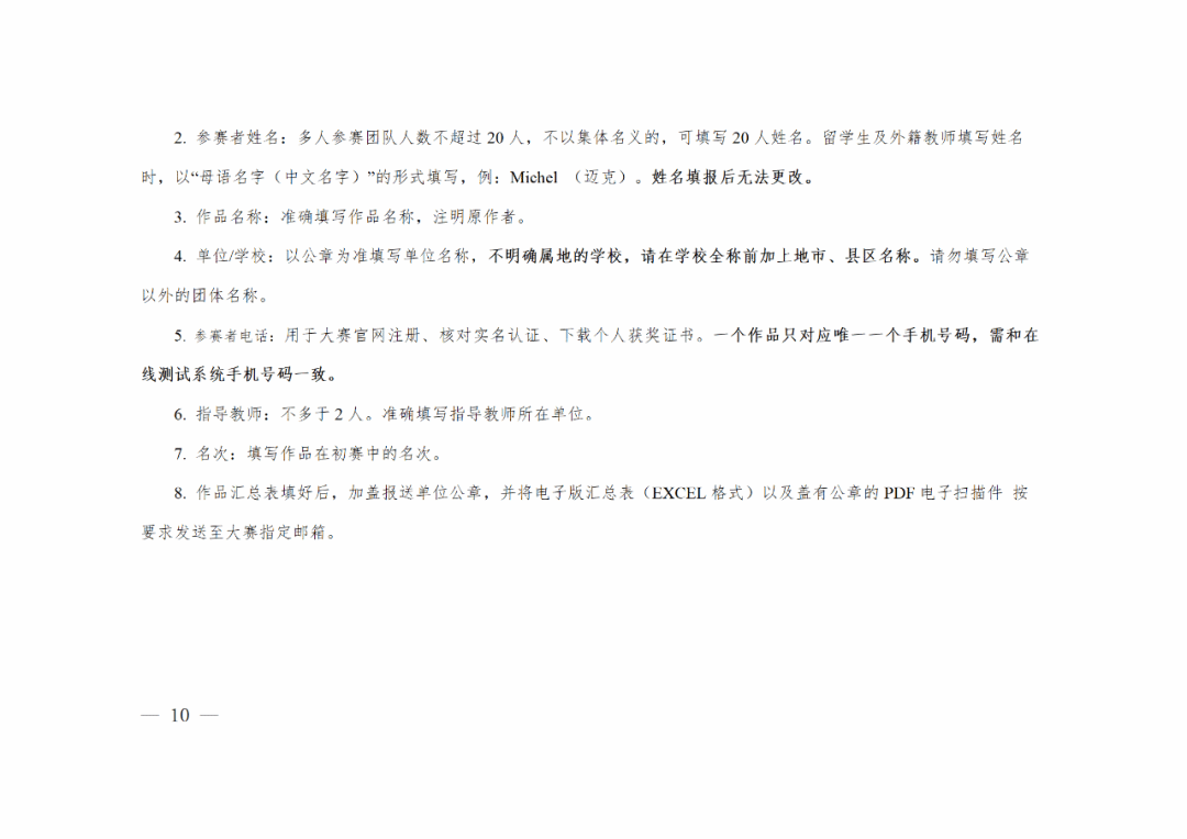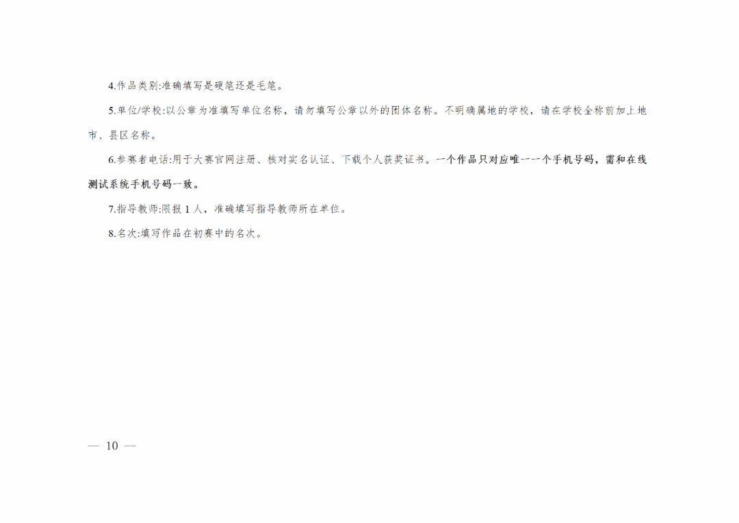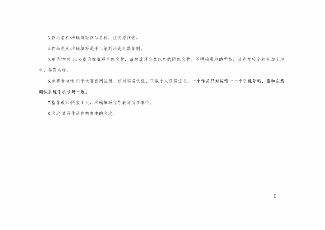 参赛信息填报须准确、规范。作品标题、所在学校等信息须用全称(不明确属地的学校,请在学校全称前加上地市、县区名称)。作品及作品信息不得出现错别字、错误名称、不规范表述等。报名的手机号码一经确定,不得更改。
