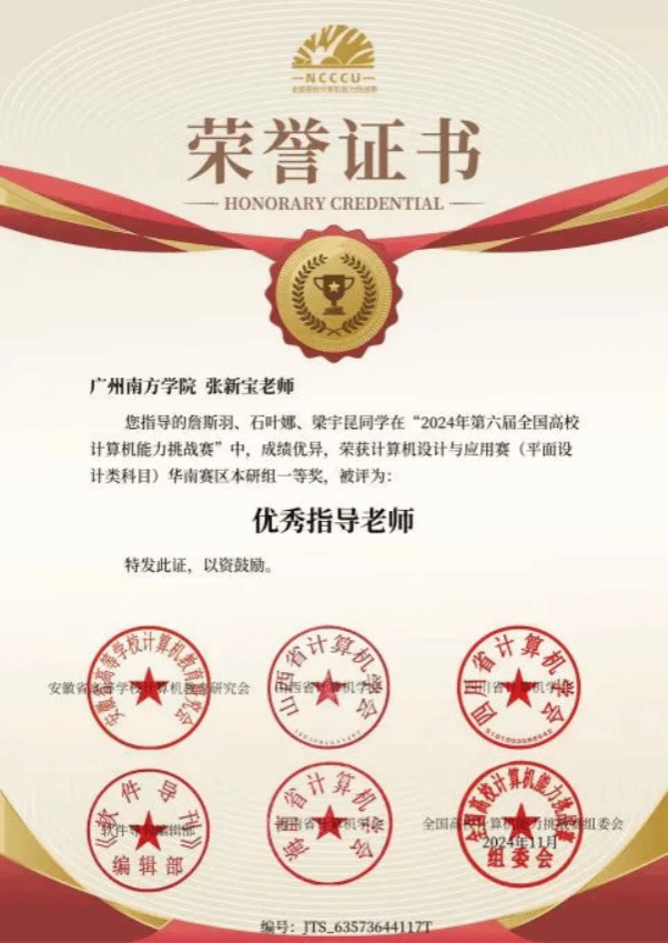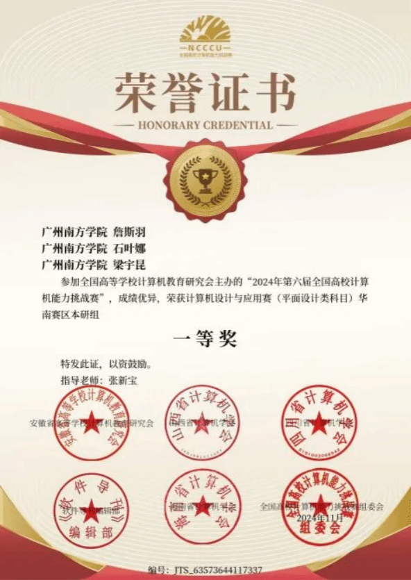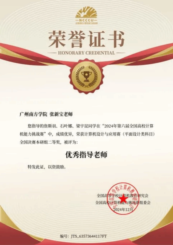 2024年11月,由全国高等学校计算机教育研究会主办的“2024年第六届全国高校计算机能力挑战赛”中,我院22级专升本网络与新媒体专业的詹斯羽、石叶娜、梁宇昆在指导老师张新宝的悉心指导下,于计算机设计与应用赛(平面设计类科目)全国决赛本研组激烈角逐中脱颖而出,凭借卓越创意和精湛技艺荣获华南赛区本研组一等奖。12月,他们再度参赛,继续展现出色实力,在同一赛事的全国决赛本研组中荣获二等奖。