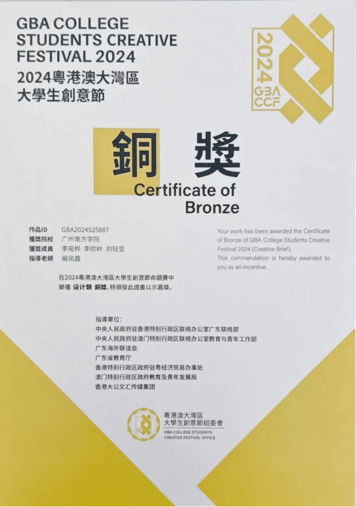 由阚凤霞副教授指导的作品荣获命题赛设计类铜奖,团队成员包括李宛桦、李欣岭和刘钰莹;张嘉伟老师指导的作品获得命题赛影像类铜奖,团队成员为陈榆皓、刘晓琪、穆以纯、王心妍和卢颖。此外,我院因组织工作出色,获得“优秀组织院校”奖。12月29日,由张嘉伟老师带队前往清远参加湾创节颁奖典礼,领取奖项。