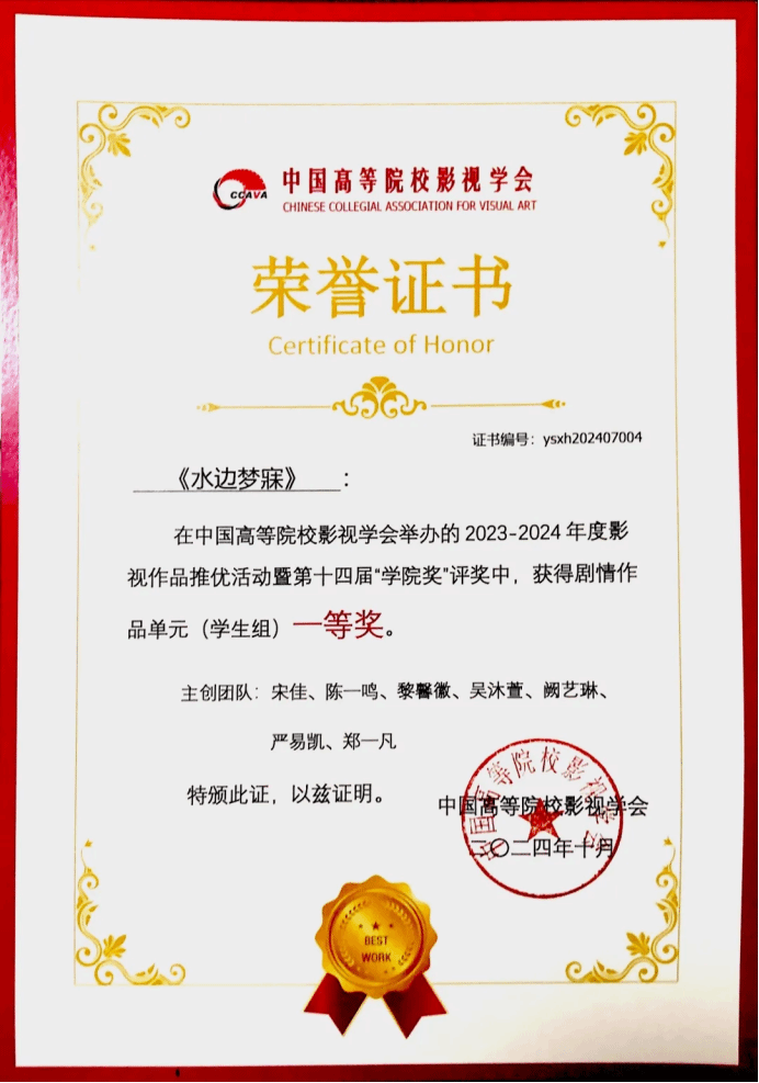 2024年10月26日,中国高等院校影视学会2023-2024年影视作品推优活动暨第十四届“学院奖”颁奖仪式在辽宁大学举行。此次影视作品推优活动的终评阶段,共有307部作品入围,其中剧情单元竞争尤为激烈,汇聚了来自北京电影学院、中国传媒大学等多所知名高校的优秀作品,共计68部。在这场高手如云的角逐中,由我院新闻与传播系邱察老师精心指导的学生团队——宋佳、黎馨徽、陈一鸣、吴沐萱、阙艺琳、严易凯、郑一凡,凭借其精心制作的剧情片《水边梦寐》大放异彩,成功斩获全国一等奖。此次一等奖在全国范围内仅评选出5个名额,而我院作品占据其中一席,这充分彰显了我院学生的卓越创作才能与不屈不挠的拼搏精神。