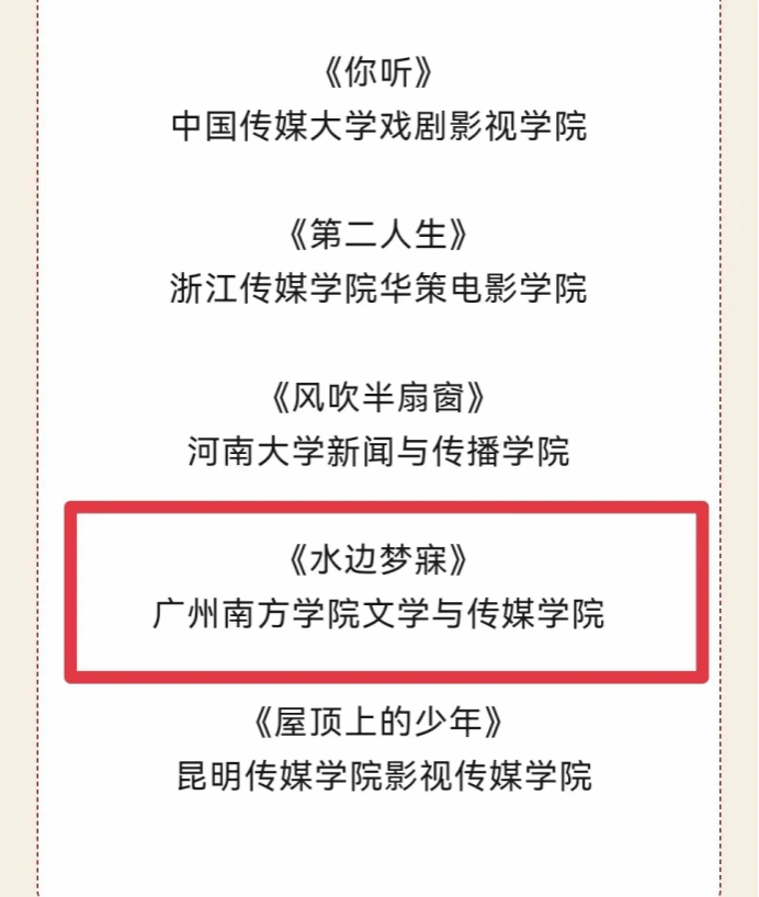 芳华灼灼,喜报沓至。2024年10月10日,中国高等院校影视学会2023—2024年度影视作品推优活动终评名单揭晓。我院新闻与传播系邱察副教授指导的学生团队(团队成员:宋佳、黎馨徽、陈一鸣、吴沐萱、阙艺琳),凭借剧情片《水边梦寐》成功入围此次推优活动名单。
