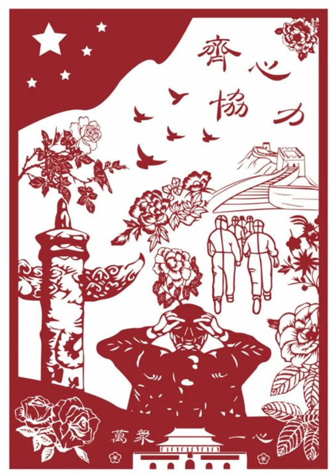 插画主题为抗疫,以抗疫工作者主角切入,同时运用中华传统——剪纸为灵感,以花相绕,以红铺色,体现了中华民族的文化自信,“待到山花烂漫时,她在丛中笑”,突出了抗疫工作者的付出,同时也表示了经过大家的齐心协力,疫情终会结束,人们的生活会更加美好,国泰民安。