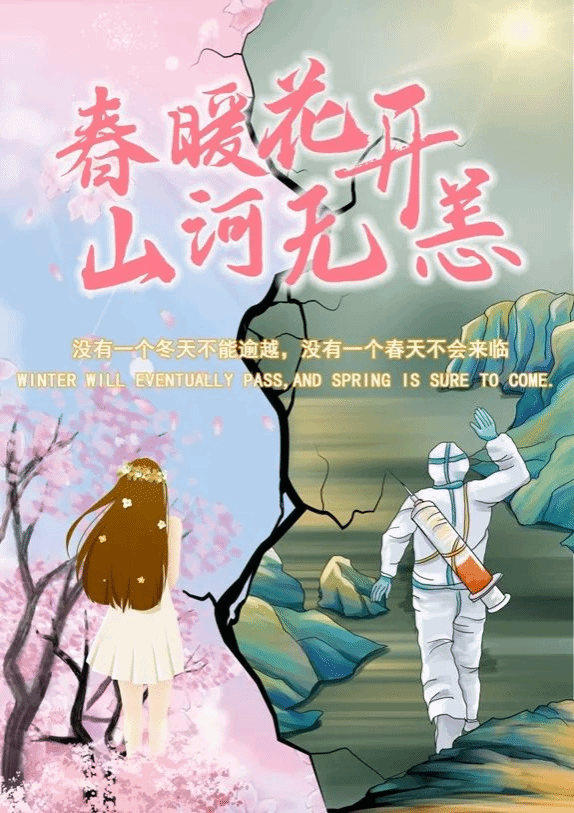 中间的裂缝寓意着经过全国人民的共同抗疫,疫情正在逐渐好转,右边的景象代表着疫情肆虐时广大医护人员奋勇向前的身影,左边的景象代表着春天已经到来,疫情终将被战胜,人们期望的自由生活重新到来。待到春暖花开的季节,愿所求皆所愿,山河无恙,岁月安康。
