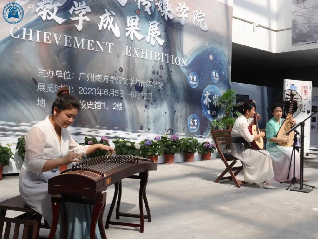 院长致辞之后,文传院陈伟霞老师手抚古筝、张晓丹老师手持琵琶,达人书院张伟萱老师手弹拨阮,三人联手带来民乐合奏《无疆》。
