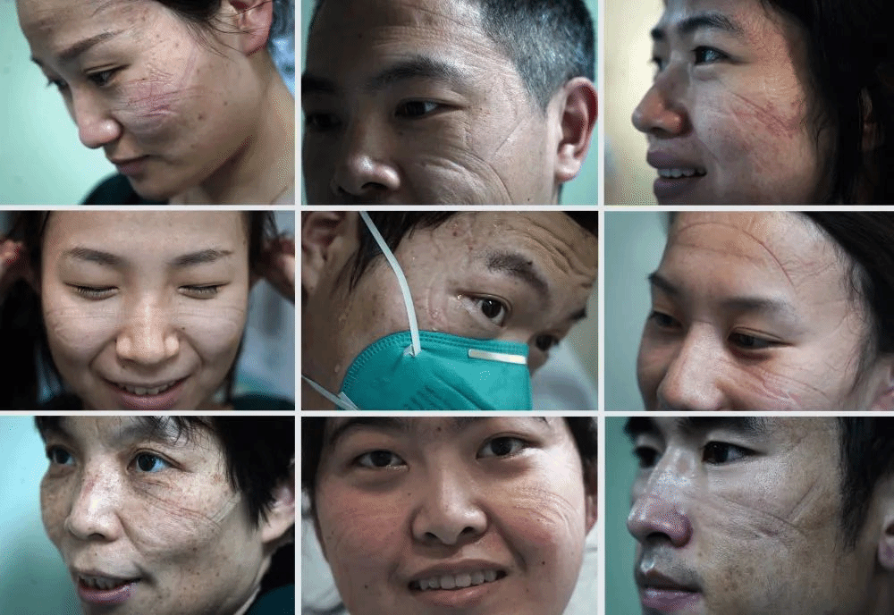 南昌大学第一附属医院象湖院区隔离病房重症监护室医护人员脸上被护目镜和口罩压出的印痕