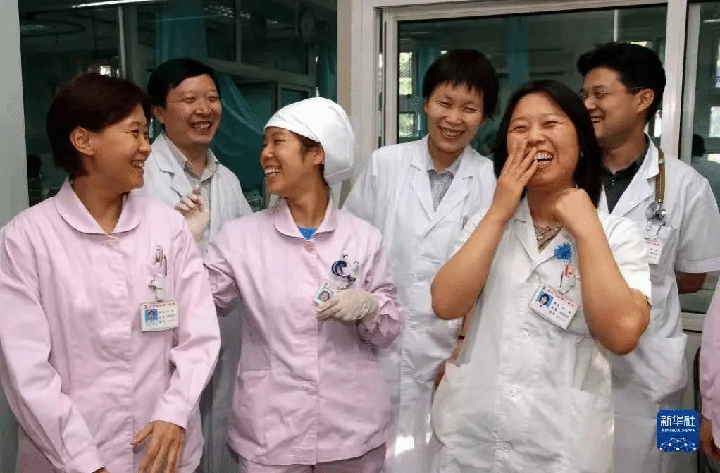 医护人员听到世卫组织对北京“双解除”的消息后露出胜利的笑容