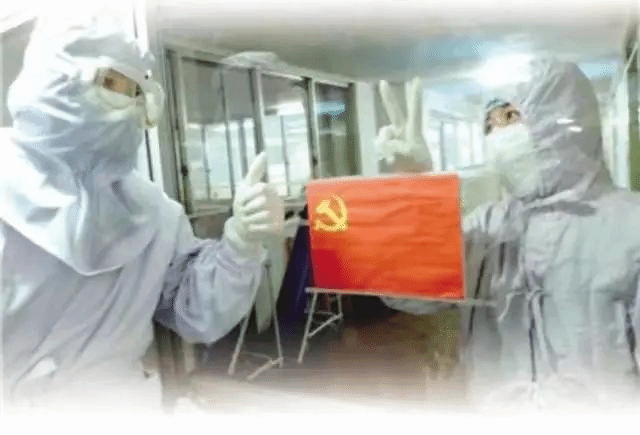 共产党员安峥医生(左)走进污染区时与外面的郭彩虹护士长做手势相互鼓励