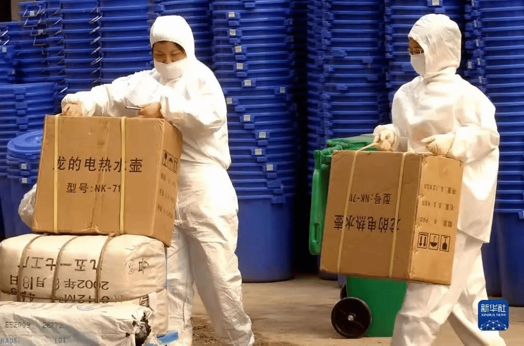 北京小汤山医院的两名后勤保障人员在向隔离病区运送物资