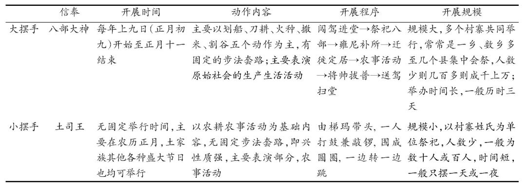 摆手舞分为大摆手和小摆手,大摆手祭祀族群众始祖,规模浩大,舞者逾千,观者过万;小摆手主要祭祀本姓祖先,规模较小。其舞蹈姿势较为生活化,动作主要取材于生产劳动、日常生活和战斗,文化内涵丰富。