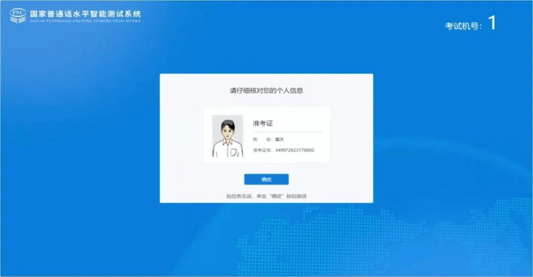 2. 验证通过后,系统将显示考生的个人信息,鼠标点击“确定”。