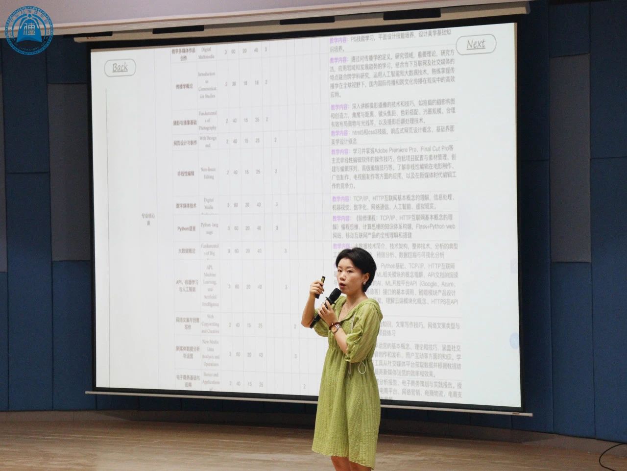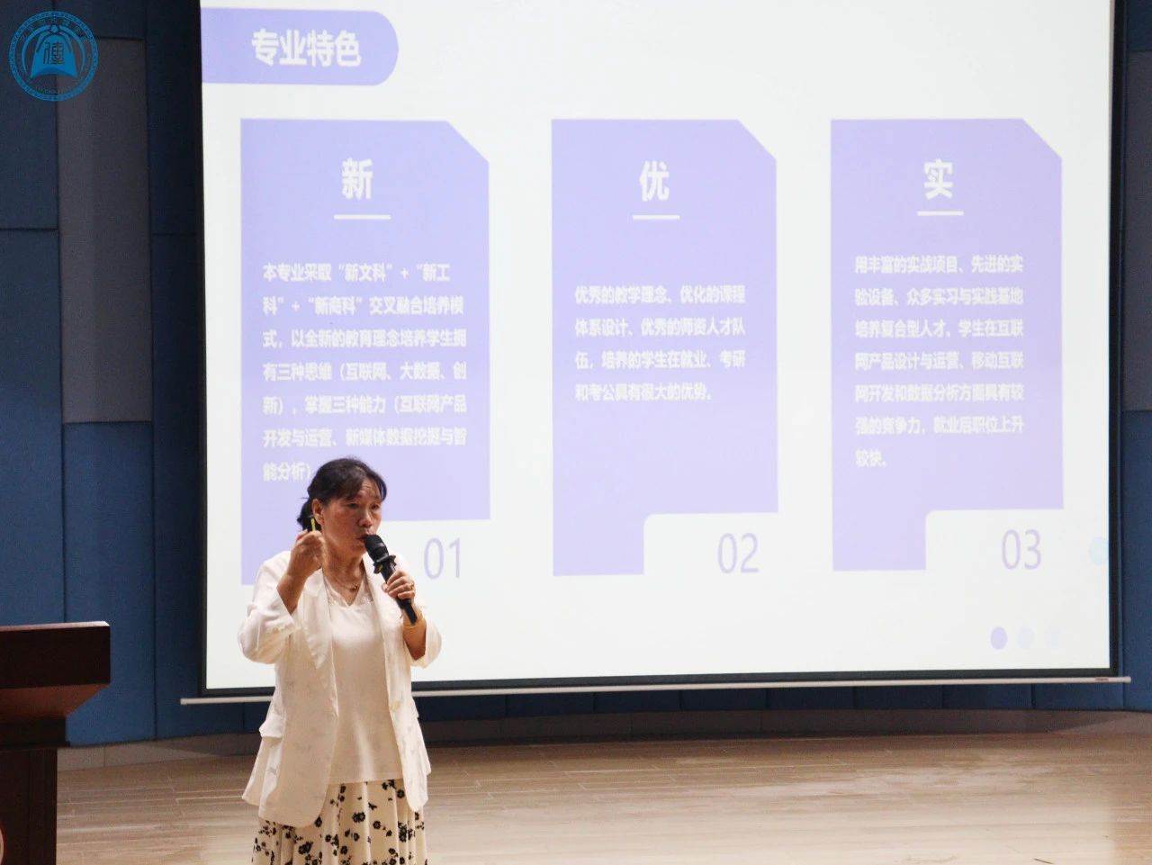 本次专业介绍会由网络与新媒体系主任胡美香教授主持,她详细阐述了本专业“新文科”、“新工科”、“新商科”融合培养的办学理念与专业特色,展示了近几年该专业教师办学成果并指出该专业是中国高水平应用型专业,学生在就业、考研、考公都有一定的优势。