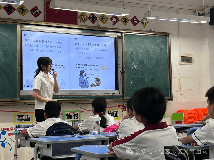 “苏轼啊,他就像我们课本里的超级英雄,不过他不是用超能力,而是用他的笔和墨,创作了很多美丽的诗和词。”小老师以孩子们能够轻松把握的语言,耐心地进行着解释说明。