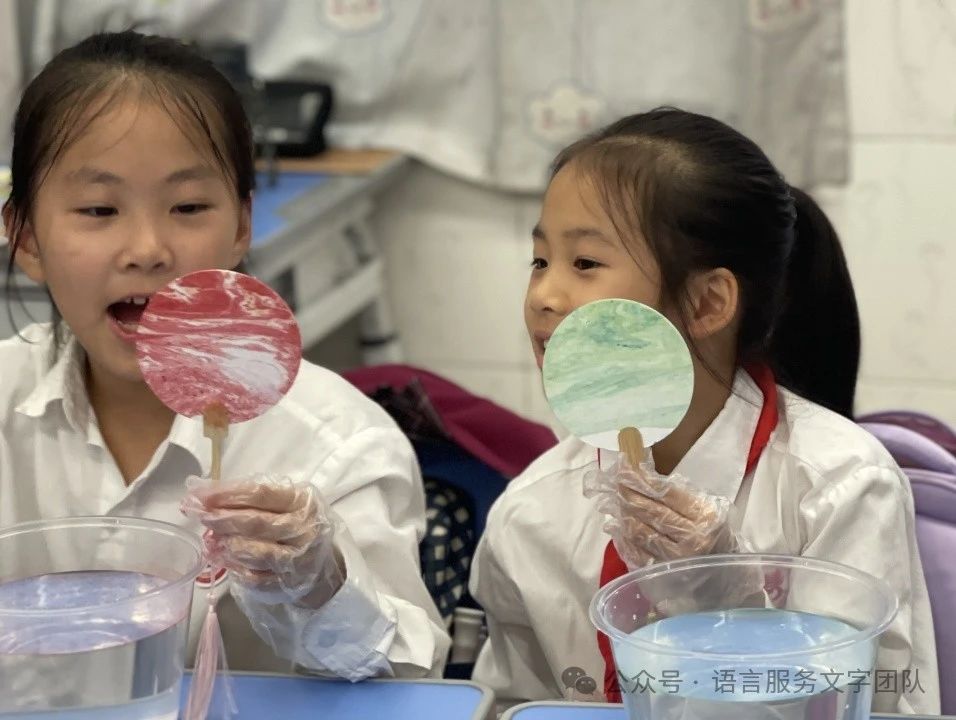 终于到了同学们最期待的时刻——动手体验制作漆扇。此次随来的小助手们帮忙发下染扇用具,同学们全身心投入到制作漆扇的过程中来。当颜料与水碰撞,瞬间绽放出炫丽的色彩,整个过程仿佛是一场与非遗文化对话的美丽仪式。随着每一层色彩的叠加,同学们手中的白扇成为了一件件独一无二艺术品。