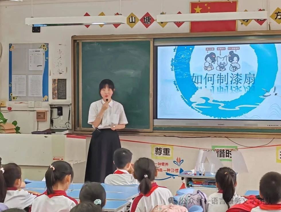 今天为流溪小学的小朋友们带来漆扇之美的“小老师”是来自文传学院22级汉语言文学专业的黄思婷同学。让我们跟随小黄老师的脚步,一起揭开非物质遗产的神秘面纱,领略“漆”彩世界的美丽吧!