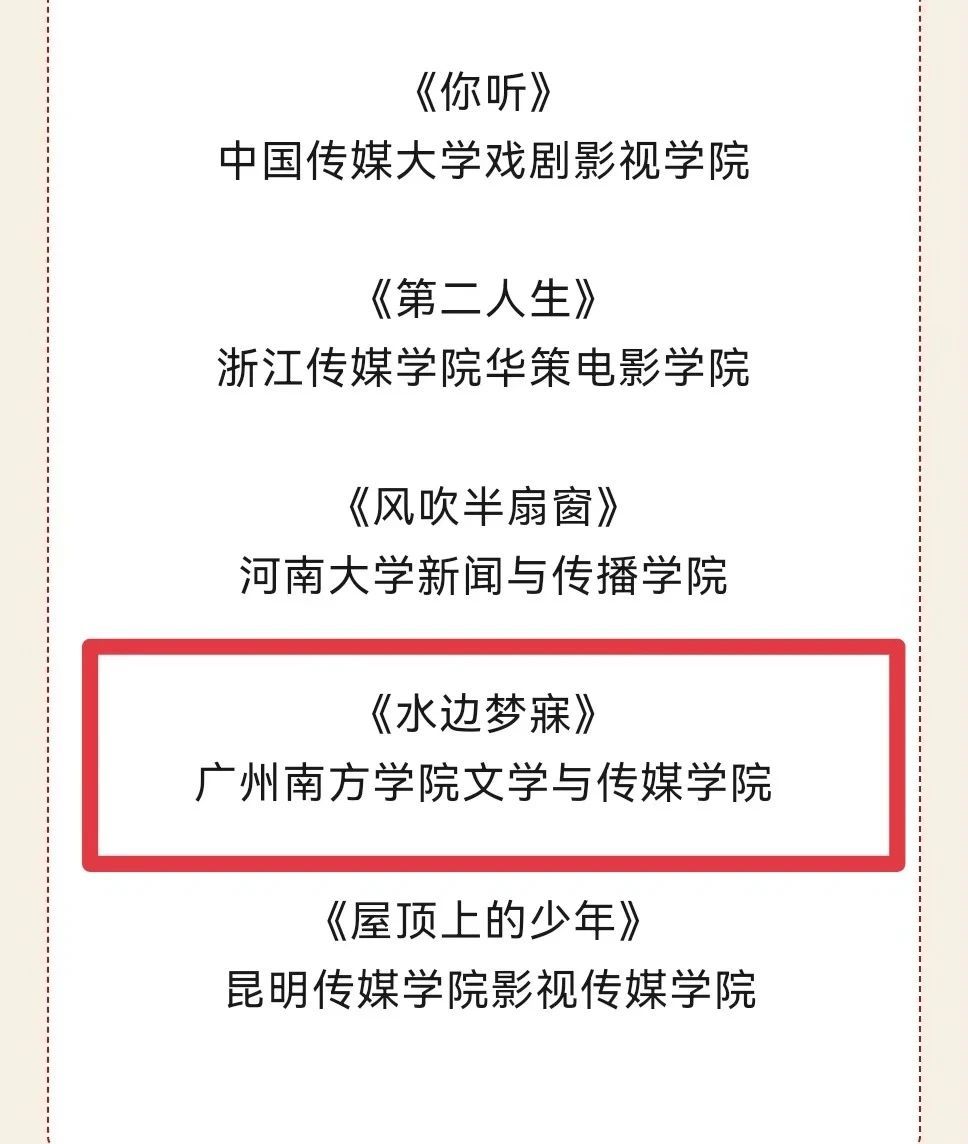 芳华灼灼,喜报沓至。2024年10月10日,中国高等院校影视学会2023—2024年度影视作品推优活动终评名单揭晓。我院新闻与传播系邱察副教授指导的学生团队(团队成员:宋佳、黎馨徽、陈一鸣、吴沐萱、阙艺琳),凭借剧情片《水边梦寐》成功入围此次推优活动名单。
