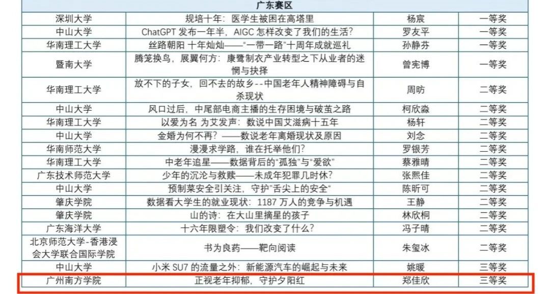 捷报连连,佳绩再续!在备受关注的第九届中国数据新闻大赛中,来自上海、广东、陕西等十个赛区的作品经过激烈角逐,评审工作于2024年10月9日圆满落幕。在广东赛区,竞争尤为激烈,吸引了华南理工大学、暨南大学、中山大学等众多高校的积极参与,在这样的高水准竞争中,我院新闻与传播系沈轩老师悉心指导的新闻学专业学生团队——郑佳欣、吴彩茵、吴泳珊,凭借匠心之作《正视老年抑郁,守护夕阳红》脱颖而出,荣获广东省赛区三等奖,并在众多民办高校中独占鳌头,成功入围国赛!充分展现了我院学生的卓越才华和顽强拼搏精神。
