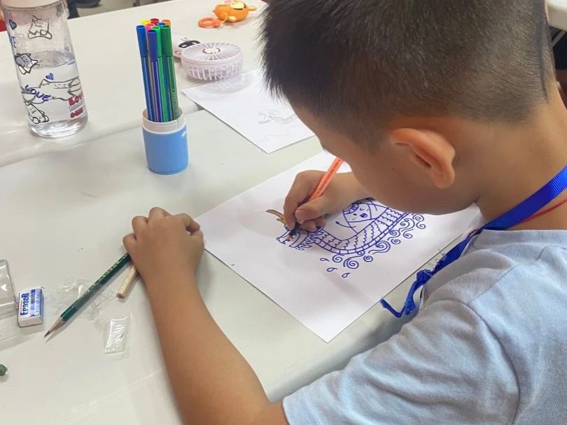 这天下午两点,我们走进龙舟雕刻趣味系列课程的第一堂,初次与夏令营的小朋友们见面。经过大家热情地自我介绍之后,我们很快和小朋友们熟悉了起来。制定好课堂纪律后,小老师们开始正式上课。首先,小老师们讲述顺德龙舟的历史渊源、与龙舟相关民俗传统、龙舟的整体构造,其中在小老师提问水埋龙舟的原因时,小朋友们积极举手回答,课堂氛围积极热烈。经过课间休息后,志愿者为小朋友们准备好纸和彩笔,跟随老师的步骤一起绘画自己心目中的龙舟。