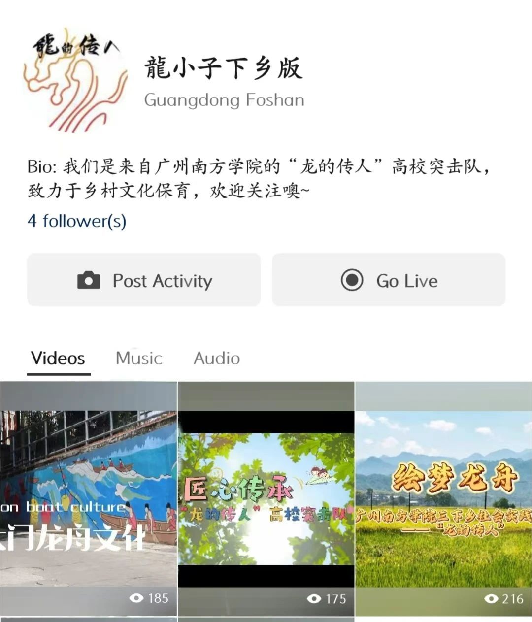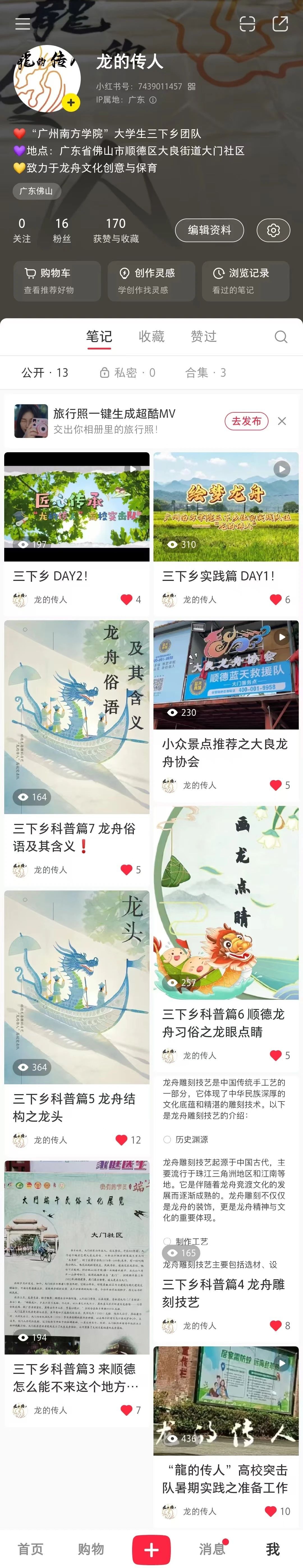 在夏令营之外,我们还借助多媒体手段进行宣传推广,我们不仅通过抖音、小红书、视频号等网络平台定期发布有关龙舟雕刻文化的动态和优质内容,用vlog、问答、宣传片等创新视频形式,还多次直播拍摄了“龙的传人”突击队的实践过程,提高了用户的活跃度和参与度。让更多的人了解和关注龙舟文化这一珍贵的文化遗产。通过团队的努力,“龙的传人”小红书账号取得了如下的成就:1.在各个平台上的用户关注数量增长了50%。2. 完成了十三篇优质内容的创作与发布。3.获赞突破150。