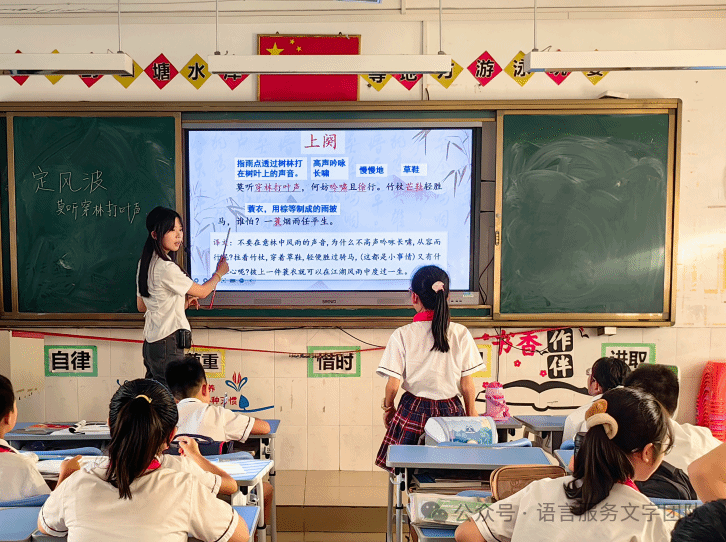 接着,小陈老师带领同学们进入了课文导读环节。通过播放《定风波》的诵读视频,同学们在视觉和听觉上更深入地领略了诗歌的魅力。小陈老师细致地指导同学们读准生僻字的读音,并鼓励他们大声朗读课文。随后,进入了诗歌讲解环节,同学们都拥有极高的热情,积极配合老师回答问题。小陈老师耐心地引导同学们逐字逐句地赏析诗词,并引导他们深入思考苏轼的生活态度和诗歌背后的深层含义。
