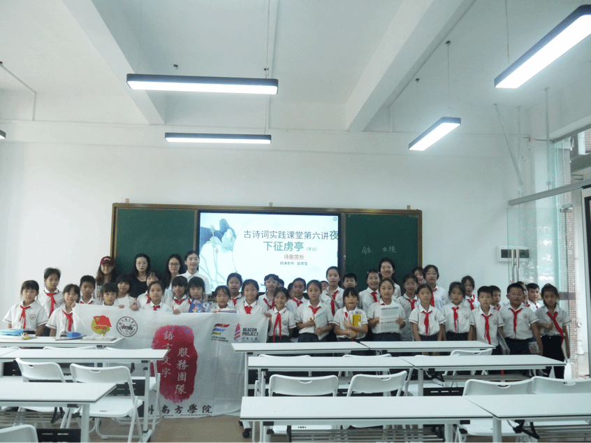 “山花如绣颊,江火似流萤。”夜幕低垂,月明星稀。李白站在征虏亭畔描绘了一幅令人心醉的春江花月夜景图,抒发他对祖国山河的热爱。10月21日下午,英国威廉集团语言文字服务团队的成员在指导老师刘涵玉老师的带领下,前往从化区善施学校,开展了一场别开生面的古诗词课程。