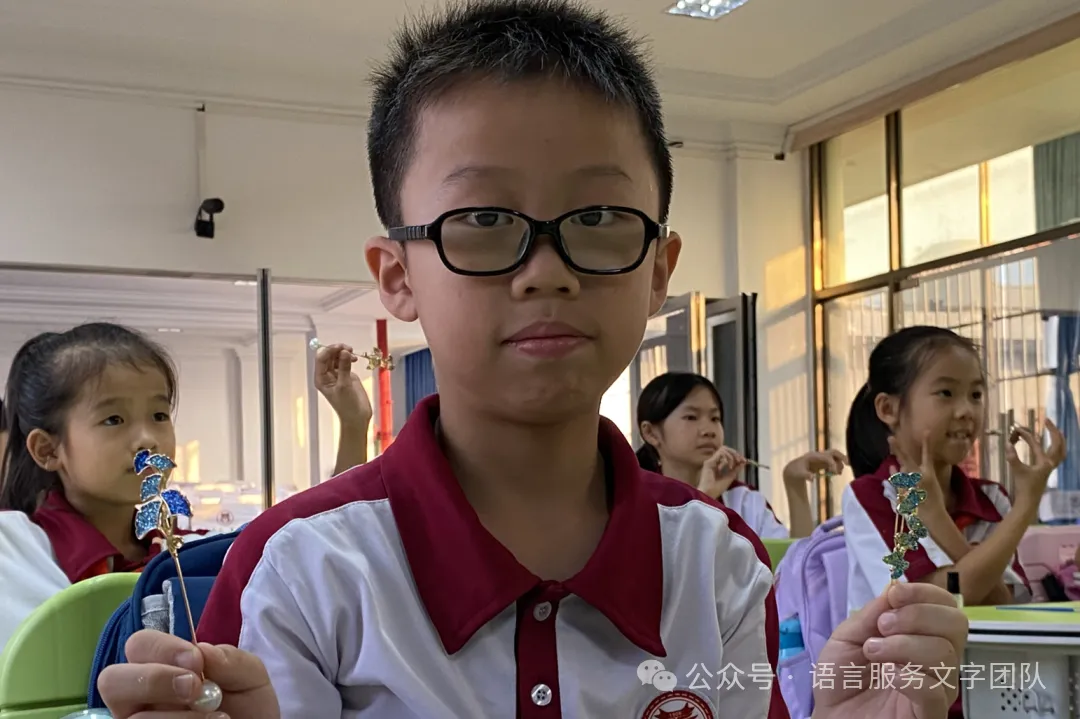 小龙老师邀请同学们进行制作感受的分享,并引导同学们积极、大胆展示自己制作的发饰成品。同学们经过此次景泰蓝发饰制作的体验后,对非遗之美有了更多的感受,积极分享感悟:“透过手中的发饰,我们感受到了亲手进行艺术创作的魅力以及景泰蓝发饰色彩碰撞带来的美妙。”最后小龙老师用景泰蓝发饰引出“今天的景泰蓝发饰体验,是对古老技艺的一次致敬;而未来,我们不仅仅要保护非遗更要传承其精神与文化内涵”。本次非遗课程就在同学们欢乐的笑声和明媚的笑脸中顺利结束。