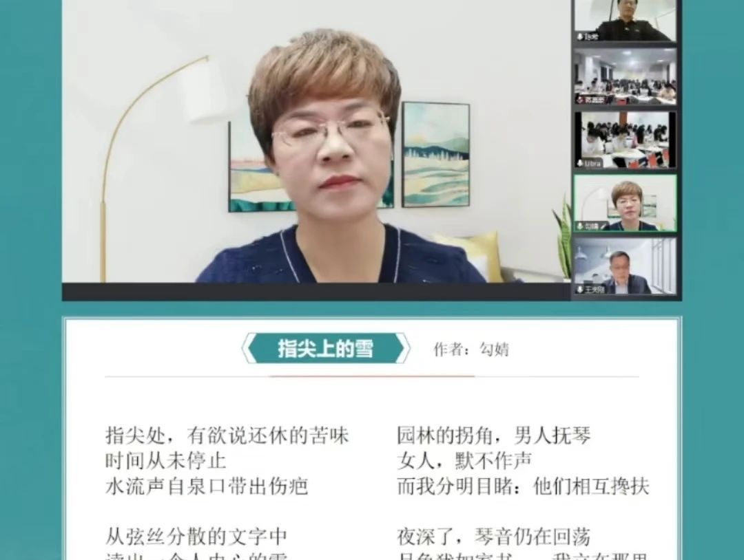 活动一开始,诗人勾婧老师首先为大家呈现了她的原创作品《指尖上的雪》。这首诗灵感源自她在北方小镇亲历的一个冬日,当时她目睹了漫天飘洒的雪花与银装素裹的大地,那番景象深深触动了她,促使她创作出了这首诗。勾婧老师还深情地分享了她在创作这首诗过程中的内心感受与心境变化。
