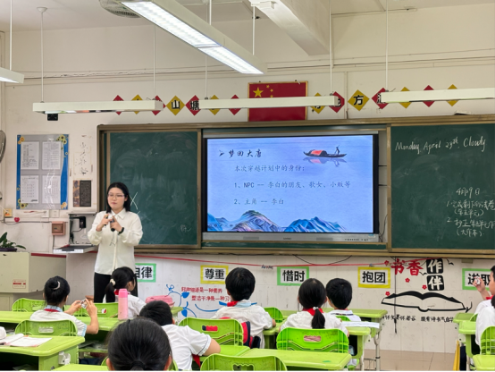 课堂开始,小陈老师通过提问“你心目中的大唐盛世”激起了小朋友们的学习兴趣。同学们踊跃举手,教室里洋溢着同学们讨论的声音,在课堂欢乐的氛围下小老师又播放了两段视频,带领学生们了解了大唐的诗都—洛阳。随后,小陈老师给每个同学发了一张唐代人物“身份牌”,不同的身份牌上印着模样不同的卡通人物,有李白、吹笛者、李白的朋友等。小老师让同学们认真听讲,结合稍后所讲的诗歌,猜猜自己拿到的人物卡片是谁。就此,大唐的穿越之旅开始了。