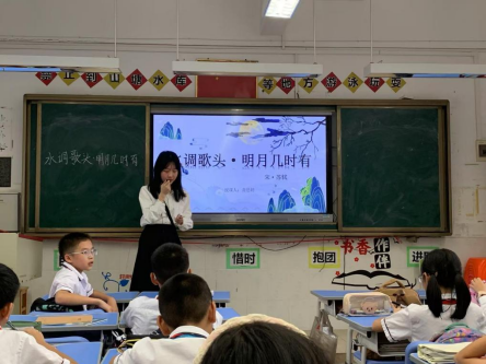 小黄老师先从字音讲起,带领同学们读准“阙”“琼”“绮”“婵”四个生字词。随后播放《水调歌头·明月几时有》的朗诵视频,让同学们在视觉和听觉上更深入地领略诗歌的魅力。视频结束后同学们踊跃举手朗诵,朗朗诗声萦绕课堂,这也进一步激发了同学们对这节课的学习兴趣。随着课堂的深入,小黄老师带领同学们逐字逐句地赏析诗词,并引导同学们走进苏轼的内心,感受他这一路的情感变化。在小黄老师的带领下,同学们不仅被苏轼和苏辙情同手足的兄弟情打动,更感悟到了他乐观豁达的人生态度。