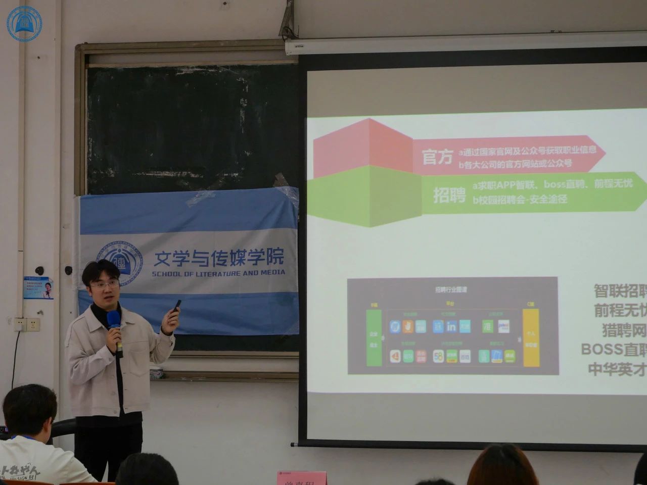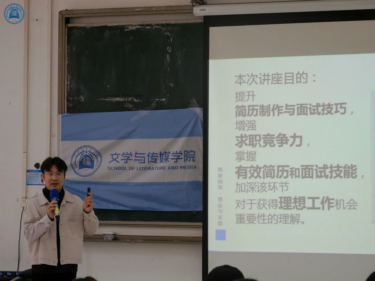 为帮助同学们详细了解招聘流程、提升求职技能、提高求职竞争力,我院于11月25日13时在2教106开展模拟求职大赛之面试技巧讲座,本次讲座由我院学生办公室辅导员曾嘉程老师主讲。