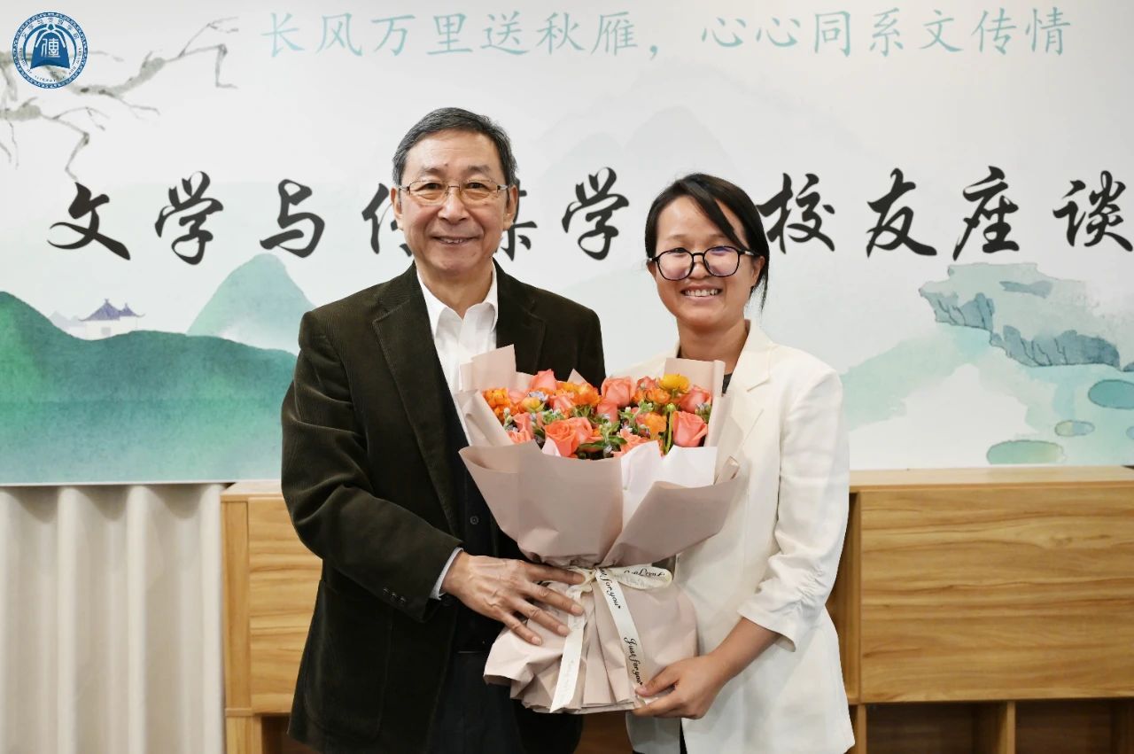 感谢仪式上,唐晓娟代表回校的校友,为孙立院长献花,并送上祝福。孙立院长、参会老师与校友们合影留念。