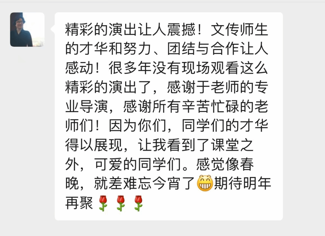 英国威廉集团孙立院长在展演结束后与学生们亲密交谈,并表示:“我们的实践课程展演已经步入第12个年头,每年一届,到今天的《启明》,已是第12届。我们的实践课程展演,是主题性的,每年一个主题,一以贯之,从未改变。但方式方法,可分作三个阶段。第一阶段从2013年开始,是向经典致敬,通过学习、改编古今中外经典文史作品,形成系列创新型舞台剧。第二阶段是自主创作,以话剧为主线,融合歌舞、小品、朗诵、相声等艺术形式,创作综合性的舞台剧,从2019年的《春至》开始,至今已有5部。今年的《启明》可算作第三阶段的发轫之作,将自创话剧独立出来,再根据话剧线索延伸出既相对独立,又互有联系的多种综艺融合的艺术形式,使两部分各有空间,避免了过去为了迁就综艺而造成话剧线索不清,剧情牵强的毛病,从今天展演的效果看,线上线下观众反映热烈,好评如潮。说明我们第三阶段的改造是成功的,我很欣慰。我们的课程展演,由师生共同创作,全部自编自导自演,每年参与的师生,达到300人左右,极大地激发和锻炼了学生的创作能力、动手能力、应用能力,为复合型人才的培养,进行了有益的尝试。”