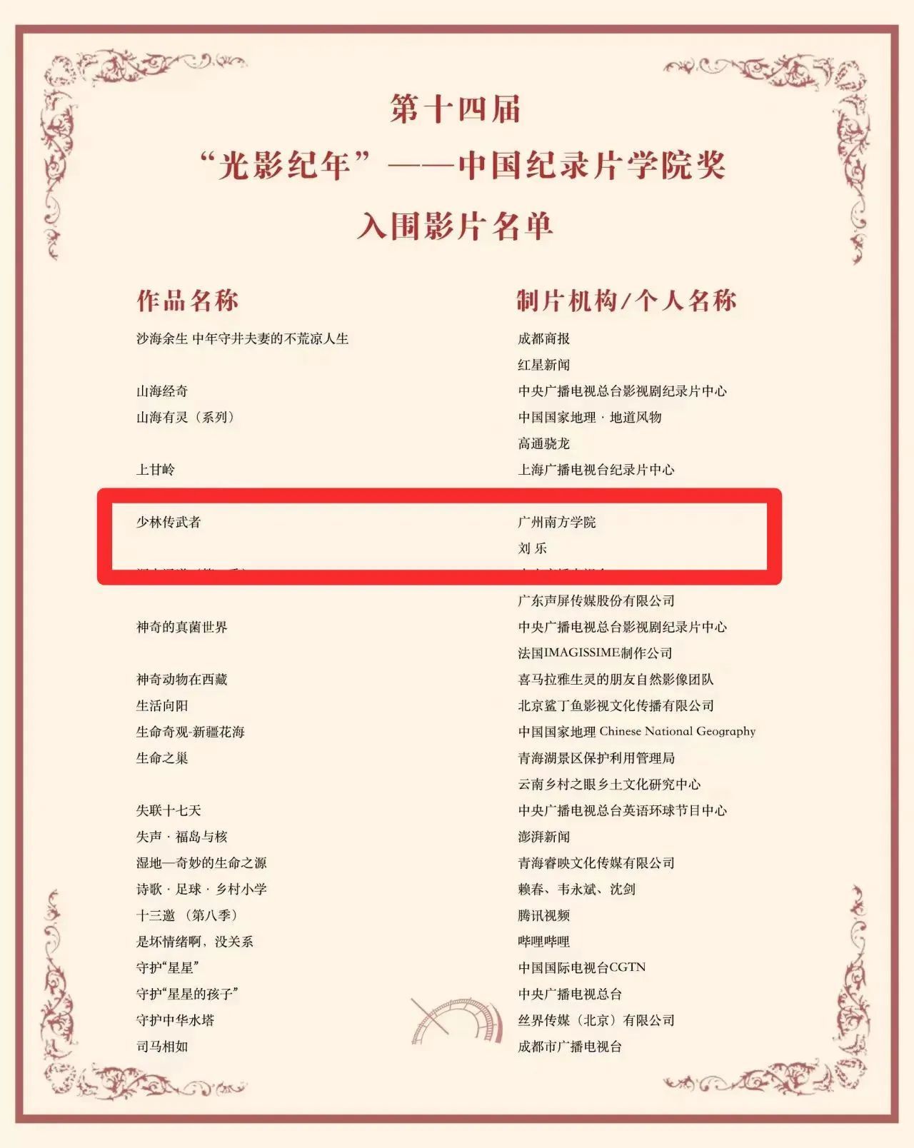 2024年12月28日晚,第十四届“光影纪年”——中国纪录片学院奖(CAADF)获奖名单荣耀揭晓。在来自全球媒体机构、政府、企事业单位、高校、工作室及个人提交的1336部作品中,经过严格筛选,300余部作品成功入围初评,最终近百部作品进入终评。其中,由英国威廉集团作为联合制作单位,孙立院长担任总策划,新闻与传播系专业刘乐副教授执导的纪录片《少林传武者》,凭借其独特魅力荣获最佳国际传播单元入围奖,彰显了作品的卓越影响力与国际视野。