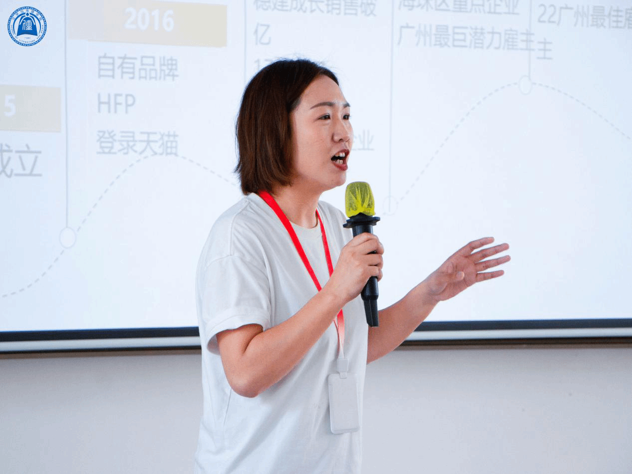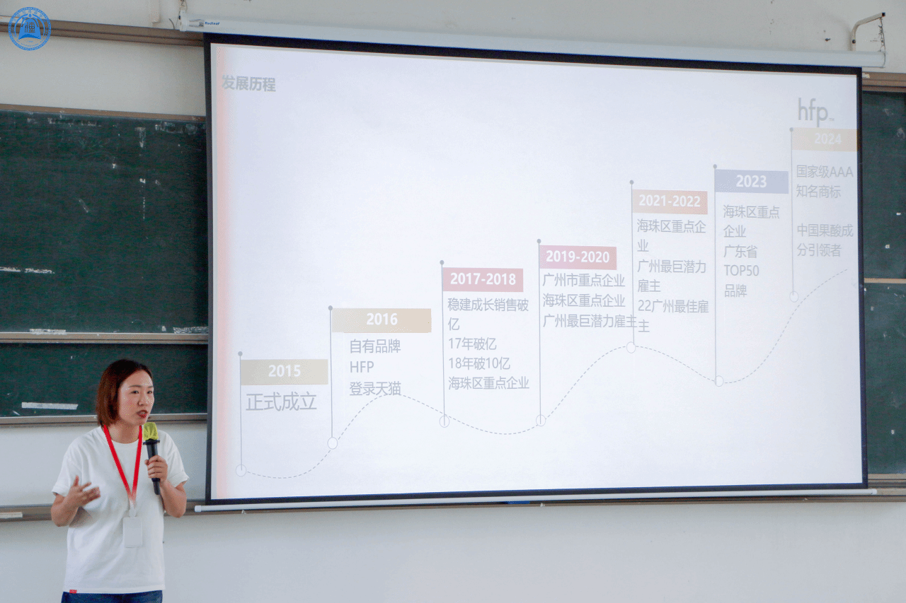 宣讲会伊始,黄小萍女士为同学们生动讲解了HFP国货护肤品牌的崛起之路。她通过展示品牌在电商平台的销售成绩以及联合互联网社交平台的创意宣发案例,直观地呈现了HFP品牌的影响力。同时,她还介绍了品牌自建研发实验室、透明化成分、国家级检测认证等,充分展现了品牌的研发实力。