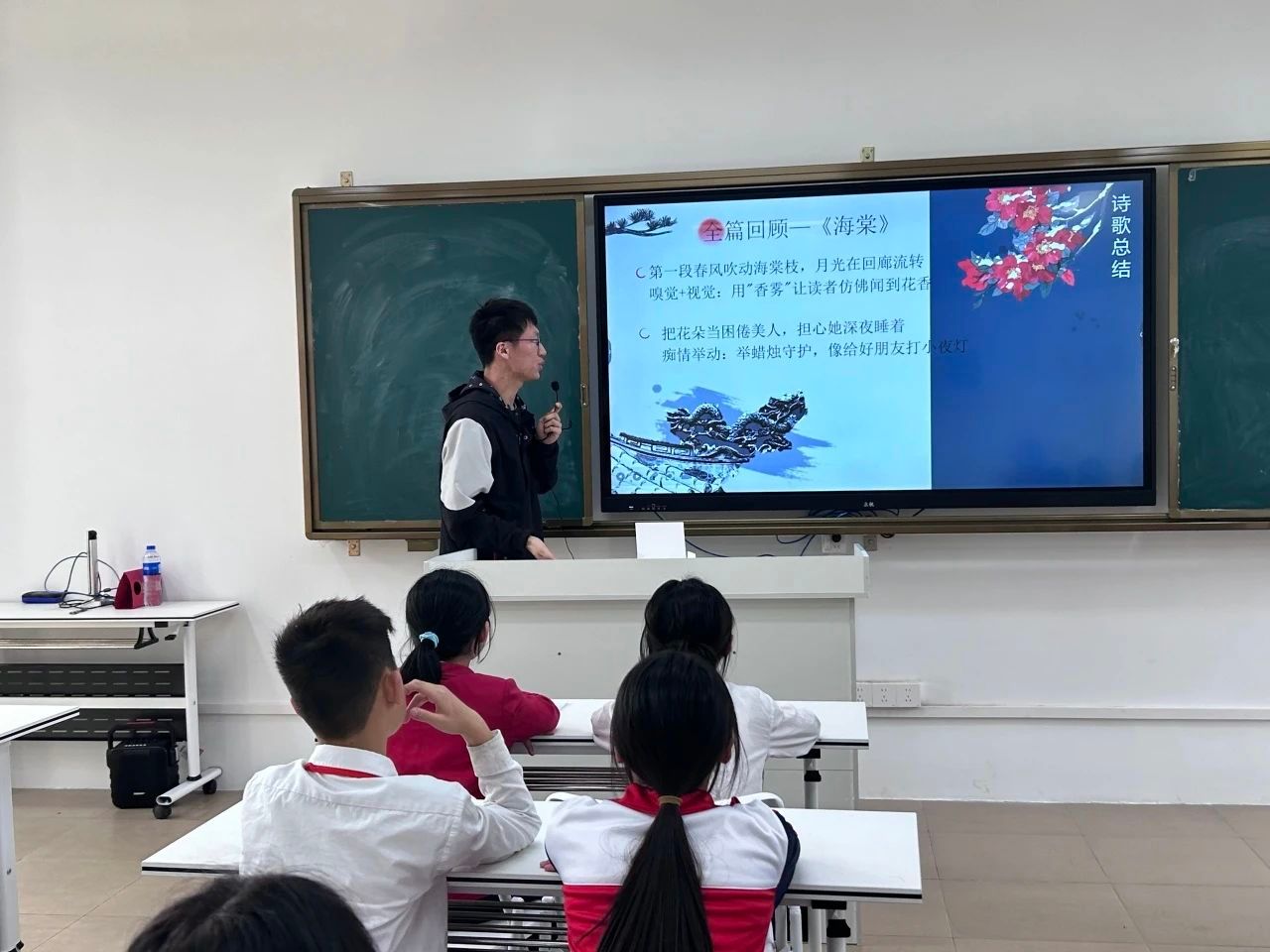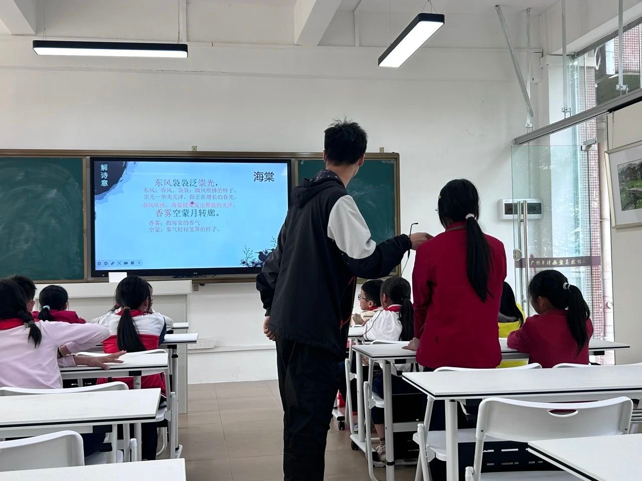 会读诗歌,也要会析诗意。小张老师向同学们一一介绍“东风”、“崇光”、“香雾”等字词意思以及“海棠春睡”的典故,鼓励学生发表对这首诗的看法和感受。“大家可以试着想象一下:春风裹着花香漫过屋檐,月光在廊柱间游移......”随着小张老师充满画面感的引导,孩子们纷纷举手发言,有人说“春风吹动海棠枝,月光在回廊流转”,也有人说“海棠花好像美人,诗人担心花儿睡着”。