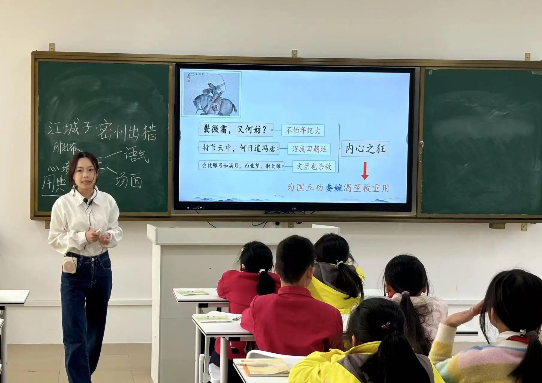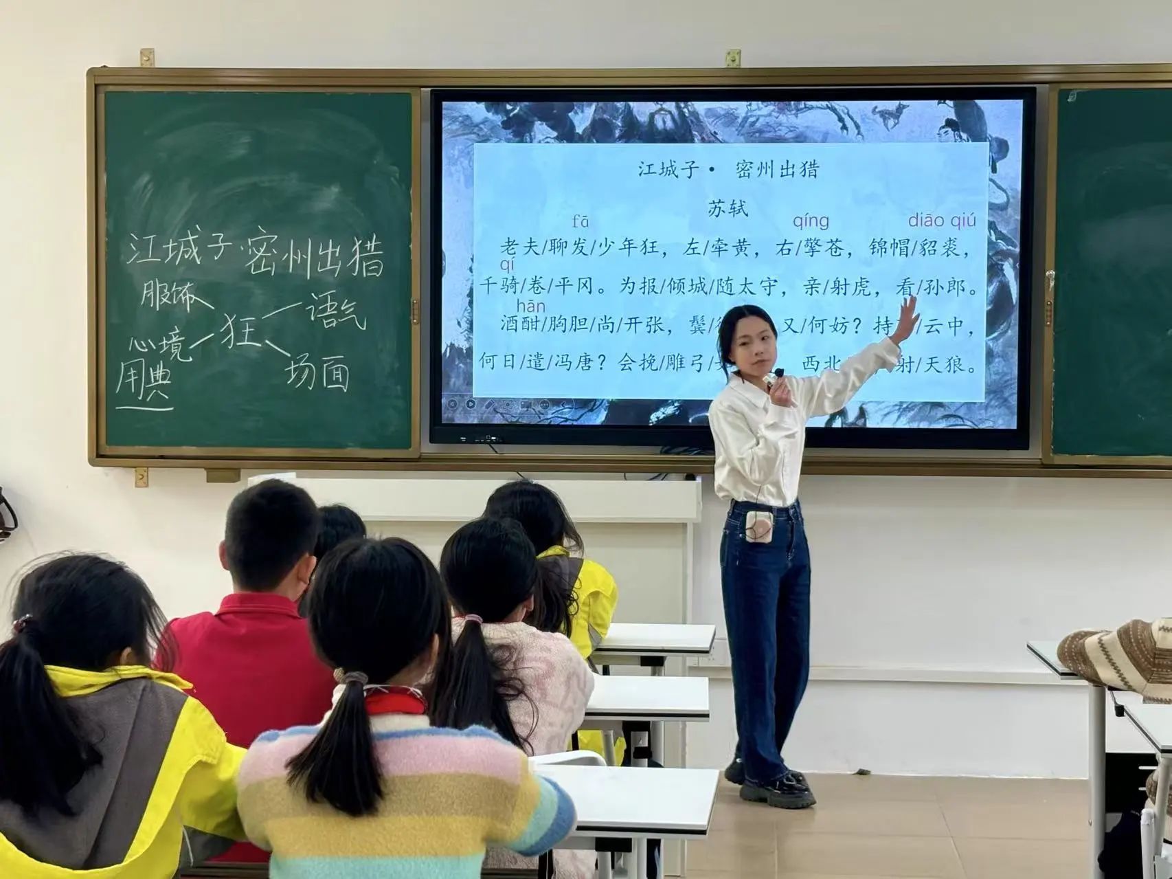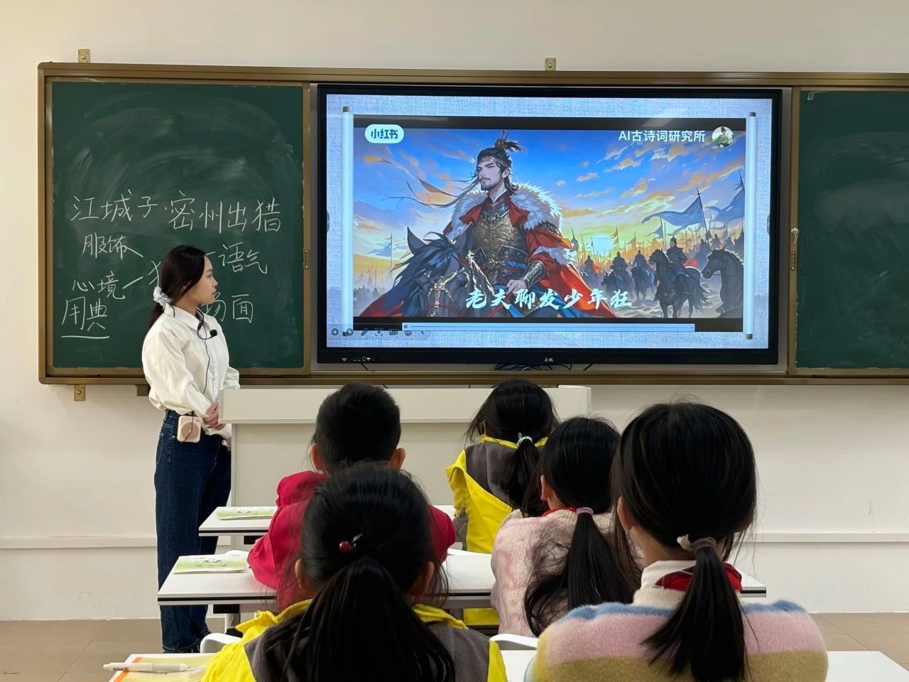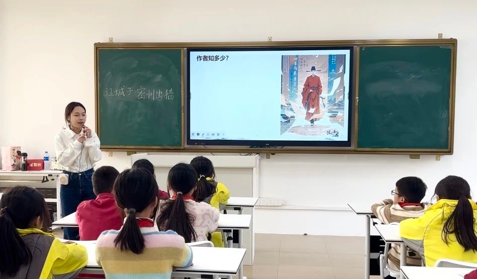 课堂伊始,小龙老师引领同学们仔细分析词的题目——《江城子·密州出猎》。她耐心地讲解道,“江城子”是词牌名,它规定了这首词的格律、曲调等形式要素;而“密州出猎”则是题目,点明了这首词所描述的主要内容。通过对题目深入剖析,同学们初步了解到,这首词主要描写出猎的盛大场景。“书读百遍,其义自现。”在同学们认识了这首词里的生字后,小龙老师开始带领大家有感情、有节奏地朗读全词。同学们的声音起初还有些稚嫩,但随着一遍又一遍的朗读,他们逐渐沉浸在诗词的韵律和情感之中,声音也越来越洪亮、越来越富有感染力。