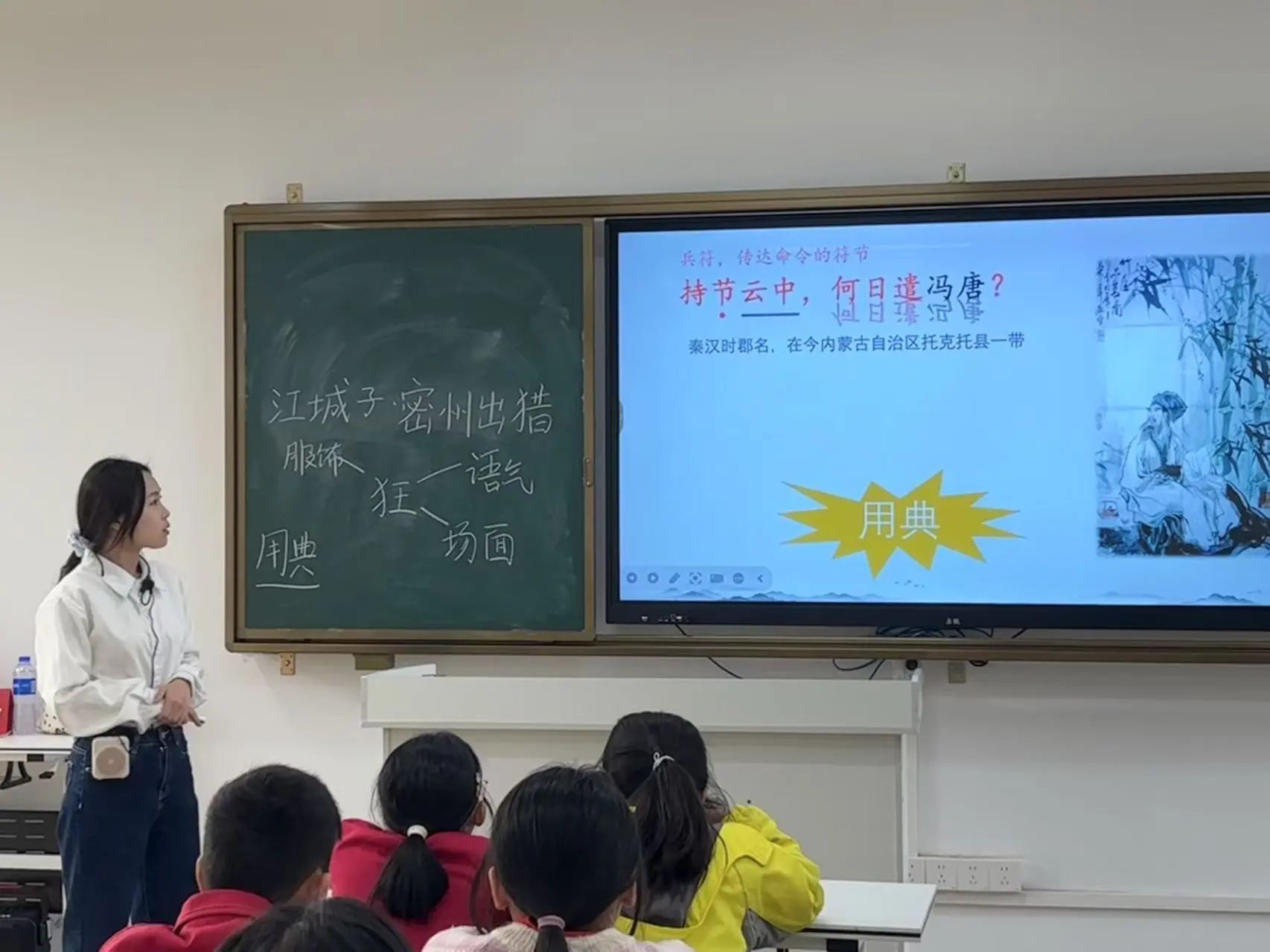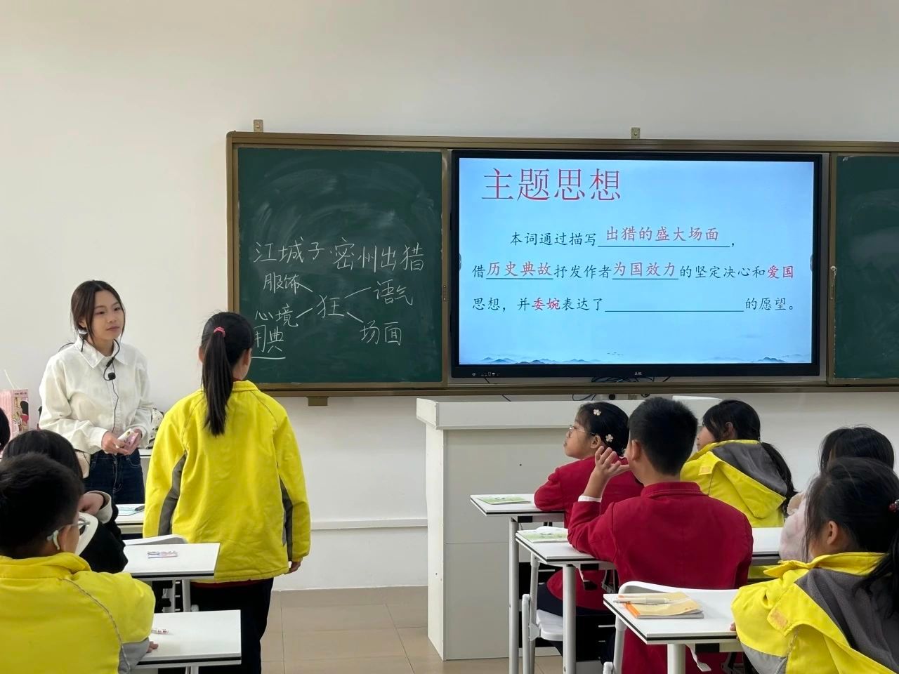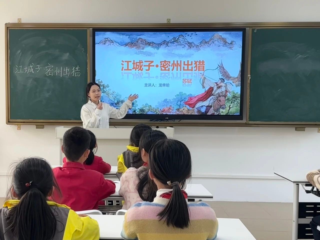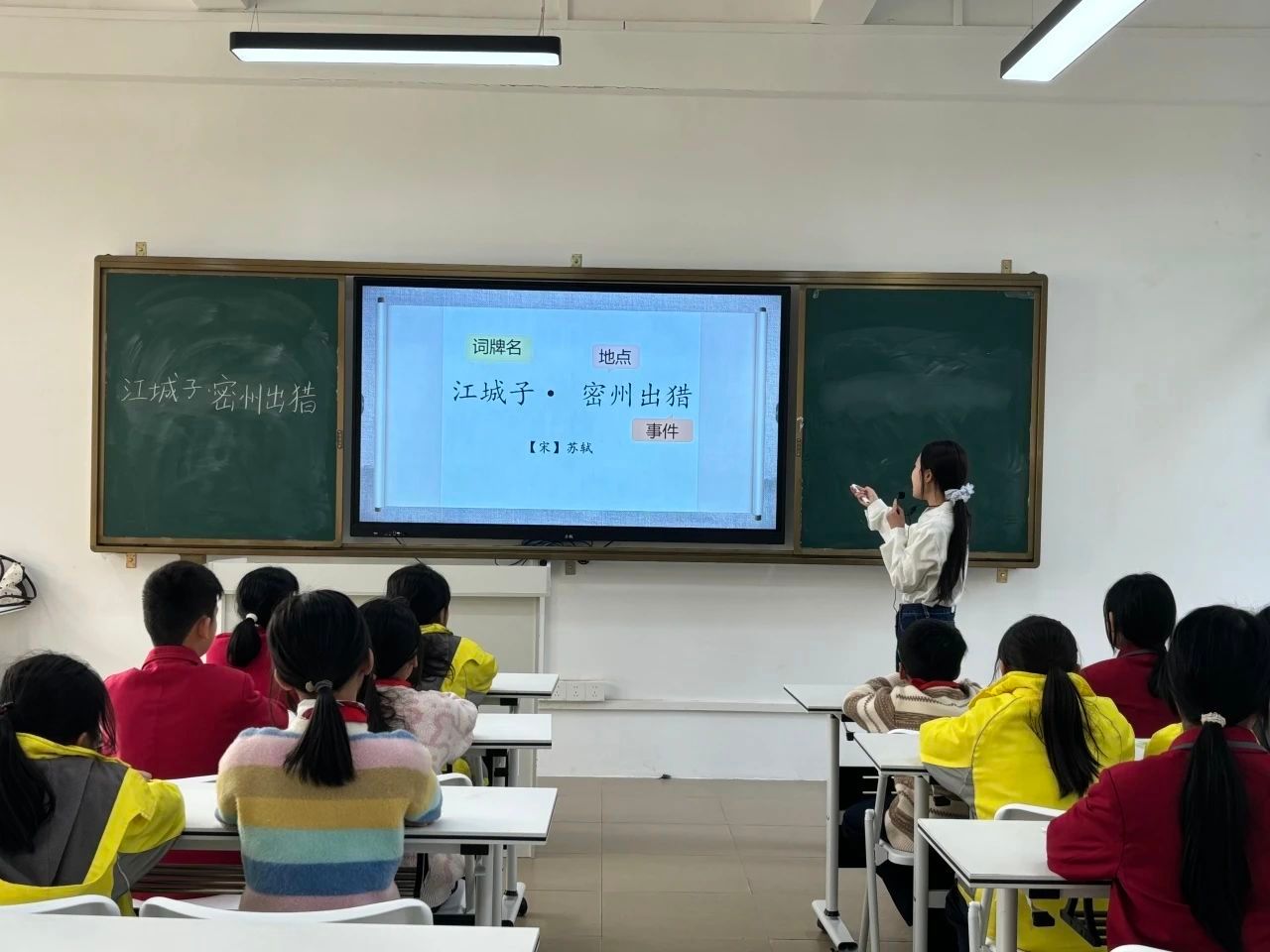 课堂伊始,小龙老师引领同学们仔细分析词的题目——《江城子·密州出猎》。她耐心地讲解道,“江城子”是词牌名,它规定了这首词的格律、曲调等形式要素;而“密州出猎”则是题目,点明了这首词所描述的主要内容。通过对题目深入剖析,同学们初步了解到,这首词主要描写出猎的盛大场景。“书读百遍,其义自现。”在同学们认识了这首词里的生字后,小龙老师开始带领大家有感情、有节奏地朗读全词。同学们的声音起初还有些稚嫩,但随着一遍又一遍的朗读,他们逐渐沉浸在诗词的韵律和情感之中,声音也越来越洪亮、越来越富有感染力。