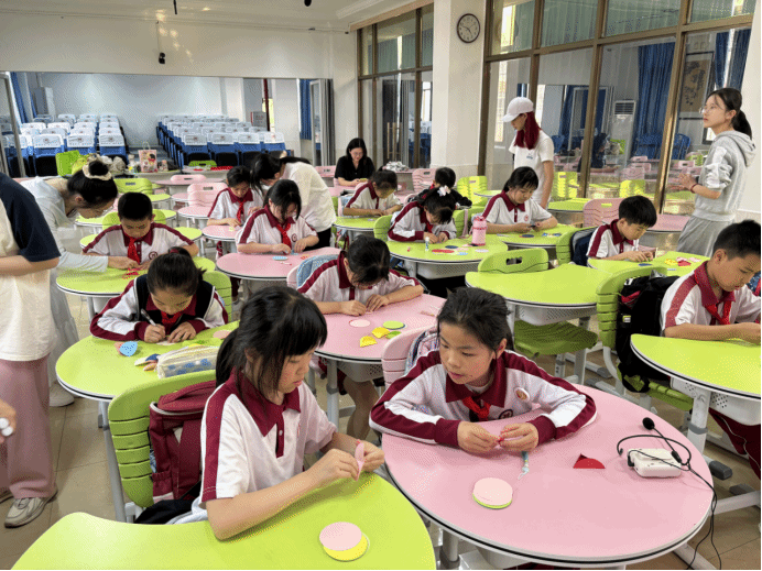 接着,小李老师播放了视频,向小朋友们展示了绣球的制作过程。一折找圆心,二折成三角,胶棒涂抹站粘起来。重复这些步骤就可以得到一个手工绣球啦!与此同时,本次课堂的小助手们为小朋友们分发制作材料,20张圆形卡片,1条红绳,1个中国结挂饰。拿到材料的小朋友们迫不及待地开始了制作。