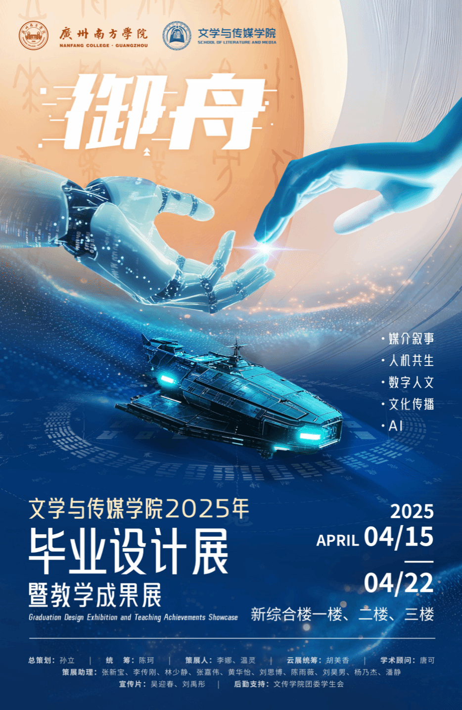 本次展览将持续至4月22日,在新综合楼一楼、二楼、三楼展出。展览以“未济、革故、同人、化成”四篇章展开,从人工智能的持续进化到人机协作的未来图景,从技术伦理到文明构建,多角度呈现文传学子对时代的深刻洞察。欢迎全校师生及社会各界人士莅临,“御舟”而行,感受科技与人文交织的魅力,见证学子们在时代浪潮中扬起创新之帆,驶向光明未来。