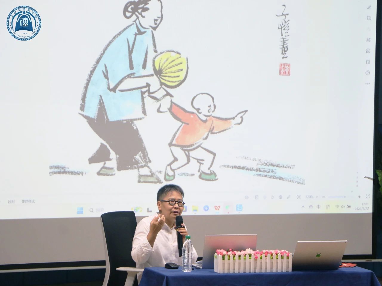 胡教授在讲座中提到,丰子恺先生将文人画简化为“文学的绘画”,以此强调绘画与文学之间紧密的联系。其漫画主要可分为护生相、儿童相、社会相、自然相、都市相这五类,胡教授对每一类都进行了详细讲解。