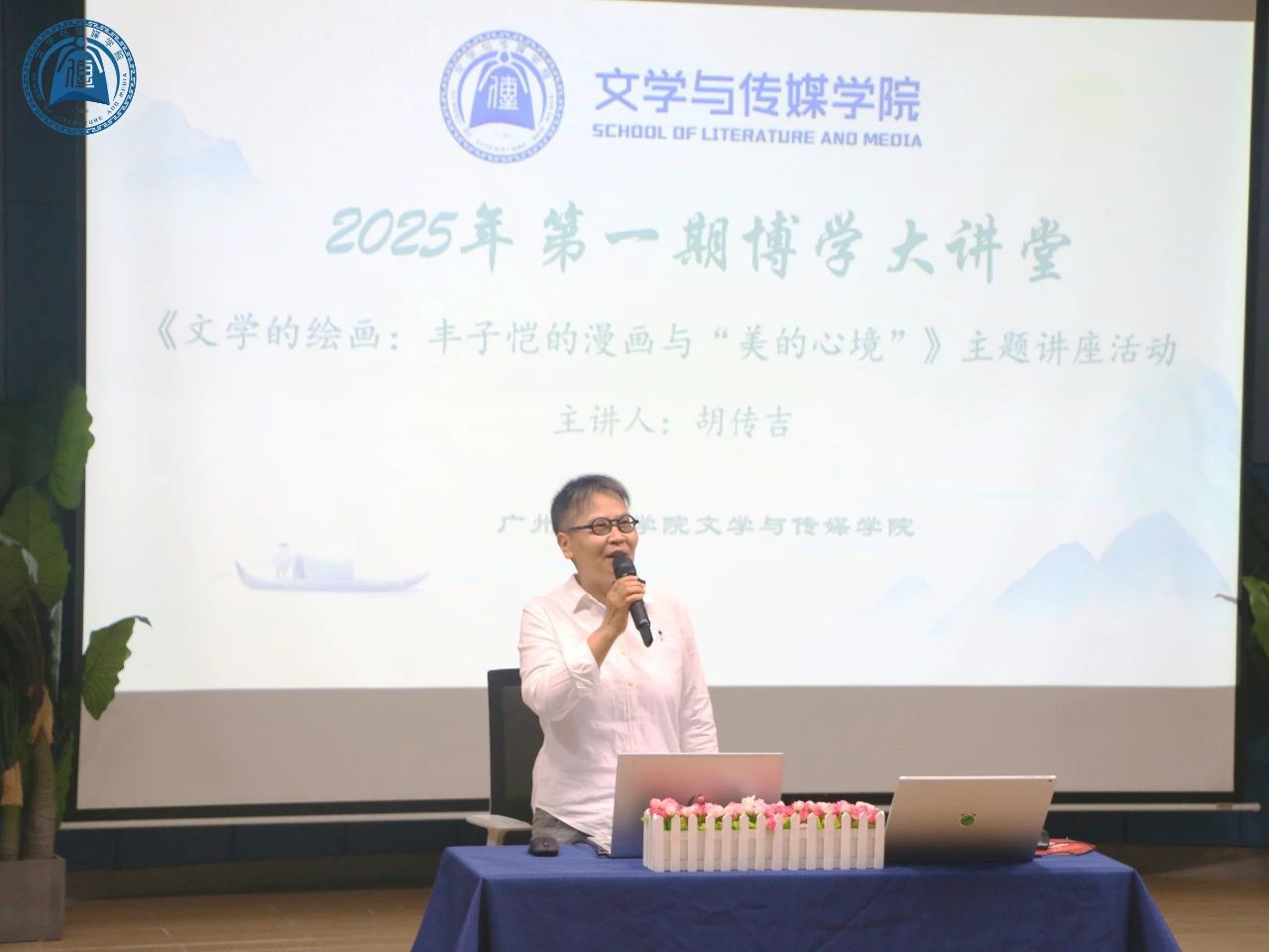 4月22日16时,为丰富同学们的课余生活,提升文学素养,培养审美情趣,博学大讲堂2025年第1期(总101期)特邀请中山大学中文系博士生导师胡传吉教授,以《文学的绘画:丰子恺的漫画与“美的心境”》为主题进行分享。英国威廉集团院长孙立教授、副院长游鸽博士,中国语言文学系张轶男老师、刘雪松老师、刘睿芝老师,新闻与传播系李娜老师,党总支副书记兼学生工作办公室主任杨乃杰老师,团委书记陈节老师,教学秘书陈贝贝老师,辅导员许洋洋老师等莅临现场。