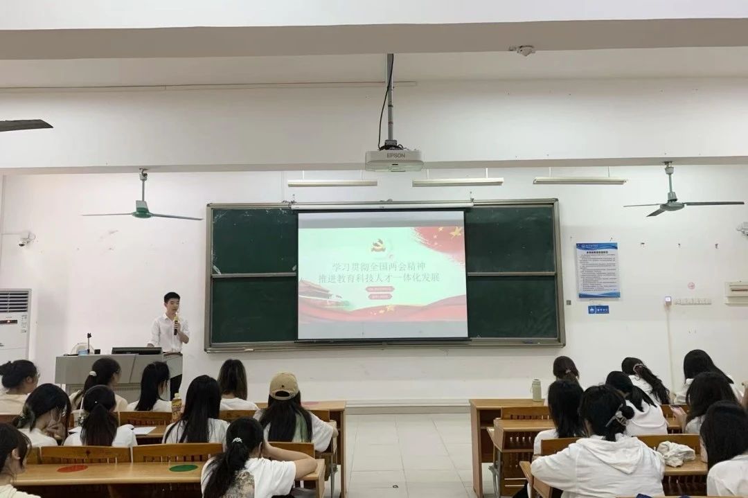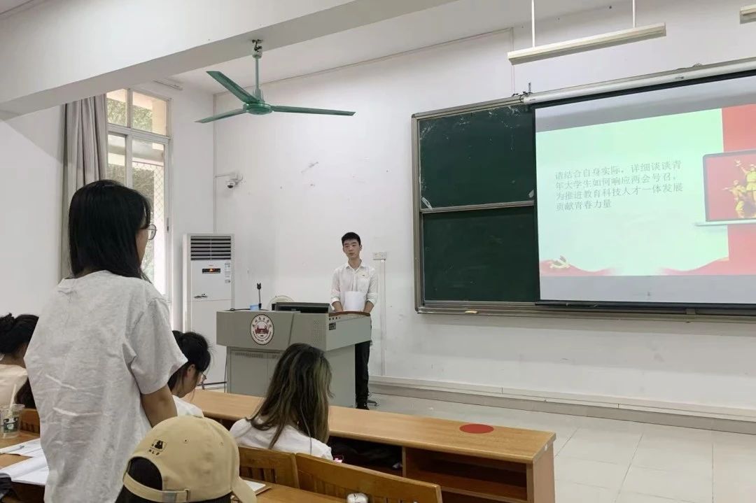 随后,夏吉良同学带领大家聚焦全国两会。通过观看视频让大家直观地了解到两会中关于教育科技人才一体发展的相关内容,以及展示了教育领域、科技领域和人才领域在两会期间的热点话题和重要成果。