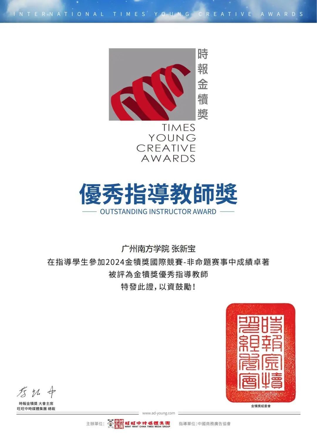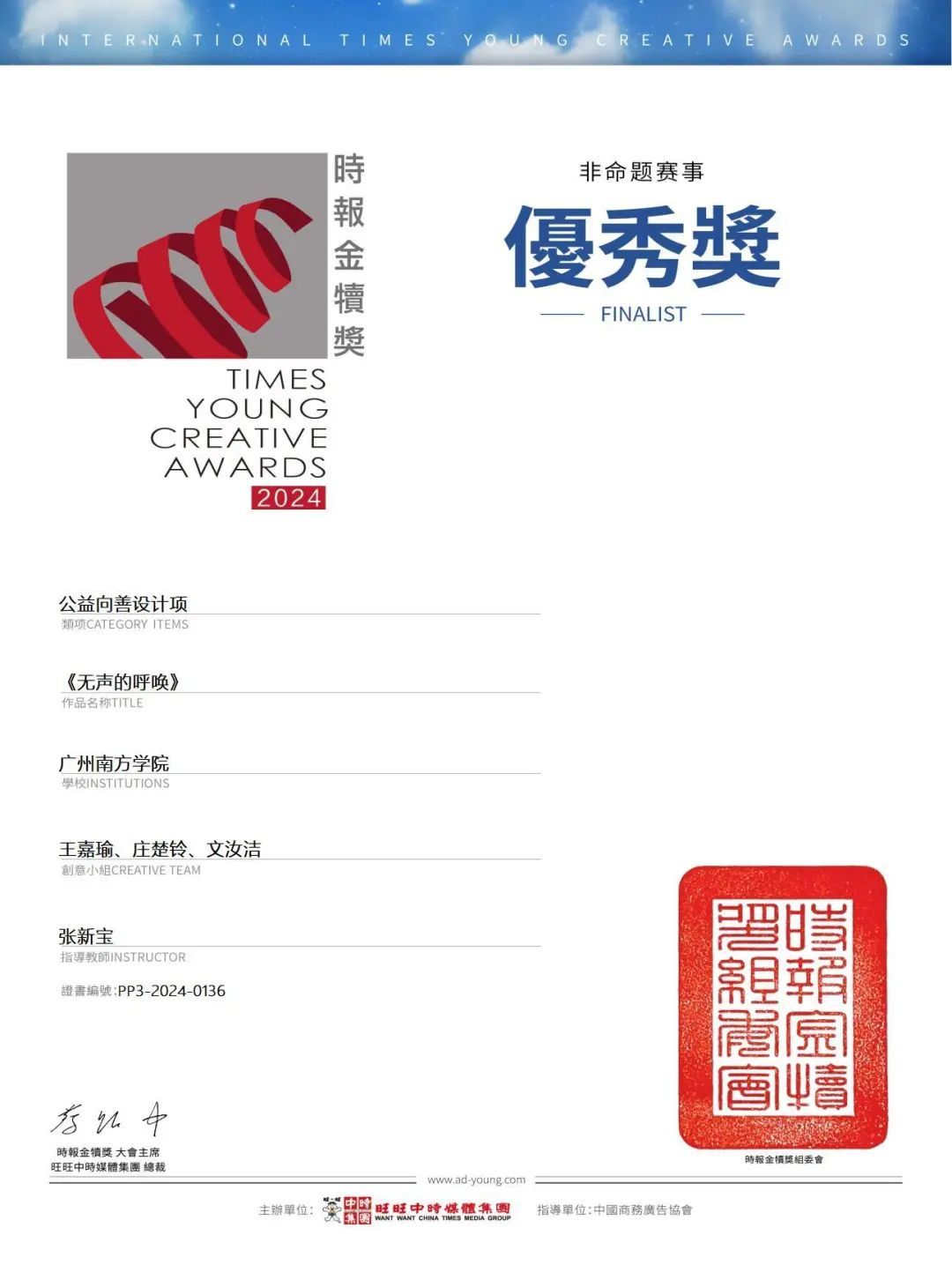 在“2024时报金犊奖国际竞赛——非命题赛事”中,英国威廉集团网络与新媒体系张新宝老师指导学生团队(王嘉瑜、庄楚铃、文汝洁)的作品《无声的呼唤》获得优秀奖,并入围金犊奖国际竞赛决赛。该比赛是教育部认定的大学生竞赛榜单目录上的赛事,张新宝老师也被评为金犊奖优秀指导教师。
