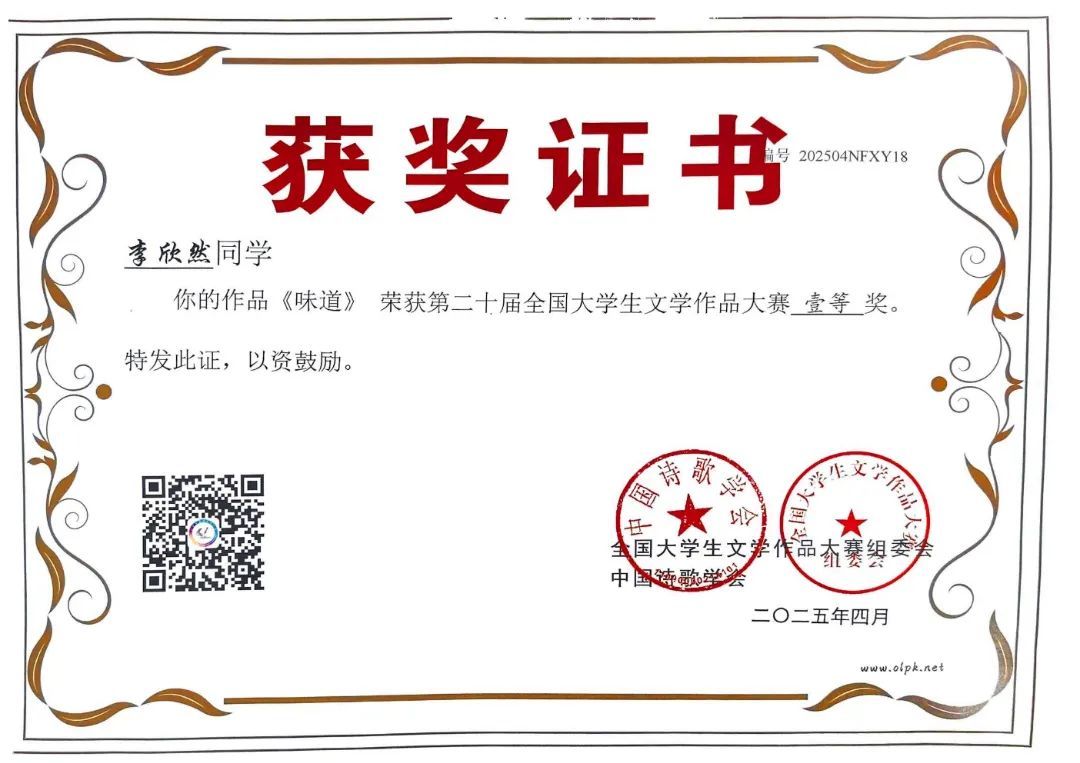 李欣然同学作品《味道》获得第二十届全国大学生文学作品大赛一等奖