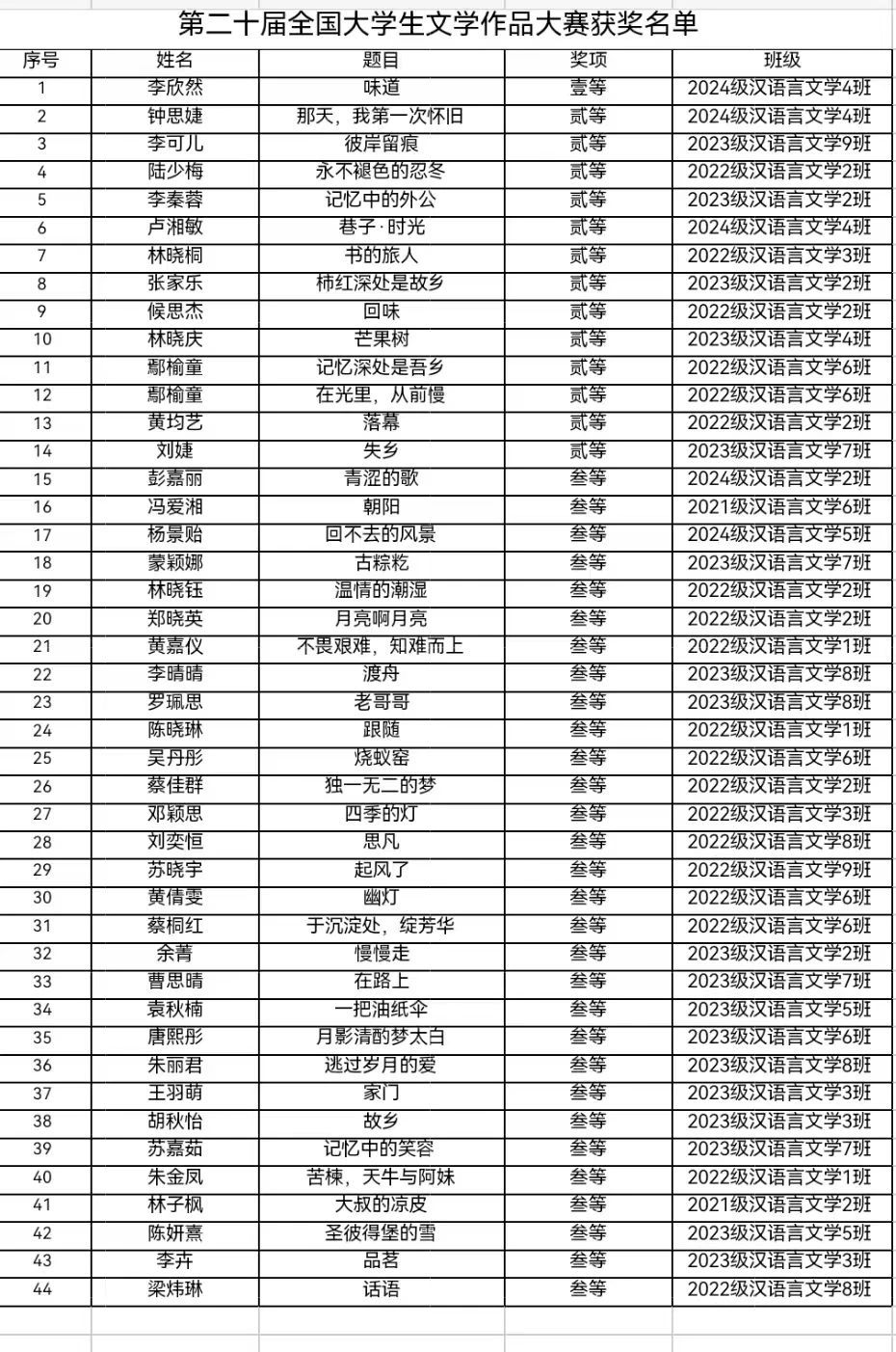 近日,第二十届全国大学生文学作品大赛评选结果公布,我院共有44名学生获奖,其中李欣然同学获得一等奖;钟思婕等13名同学获得二等奖;彭嘉丽等30名同学获得三等奖。
