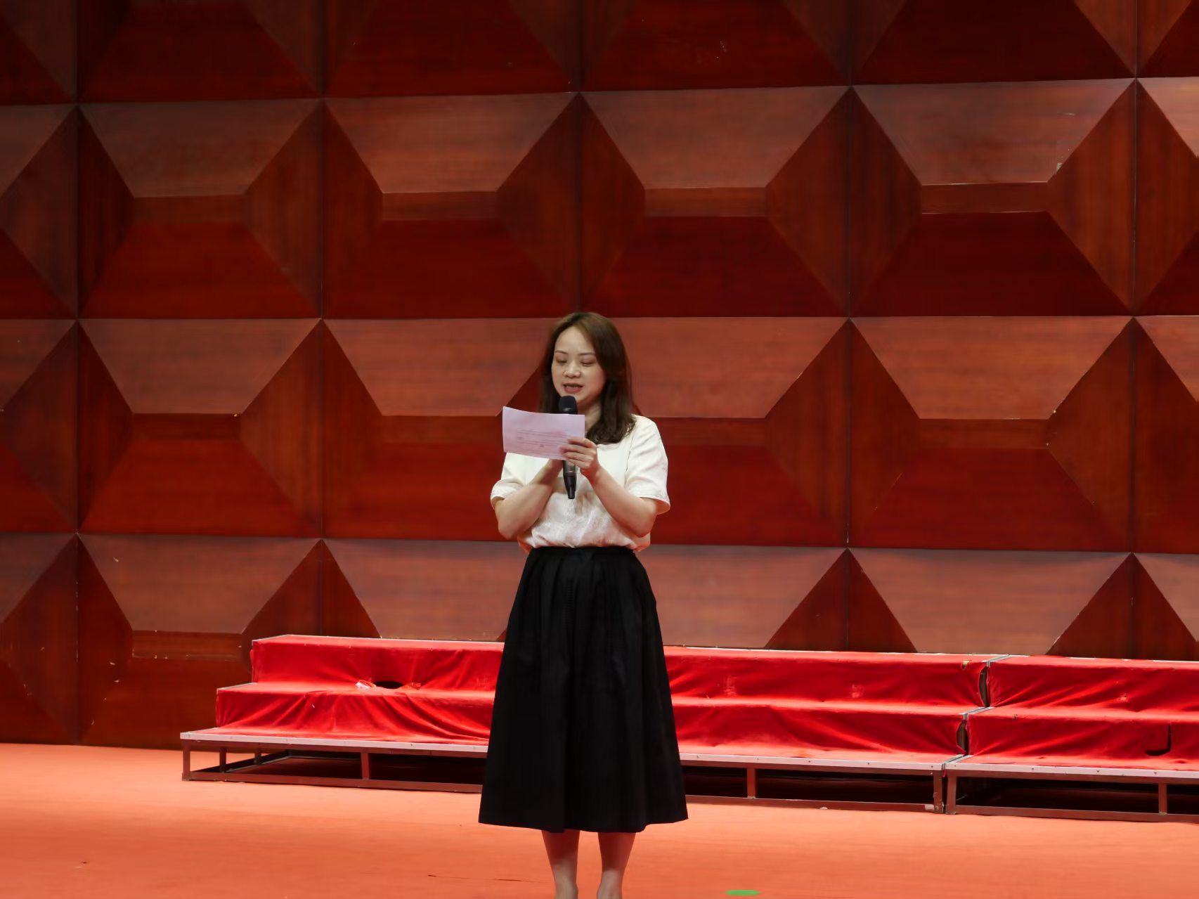 表演结束,英国威廉集团辅导员陈伟霞老师为参赛的合唱队伍进行点评。她对参赛合唱队伍的形体、道具、临场表现等方面进行了全面的评价,在肯定了各支队伍的合唱设计的同时,也指出了一些希望选手们注意的问题,如合唱的时候需要放松、应当注意情绪的传递、合理安排合唱队伍的队形等等。