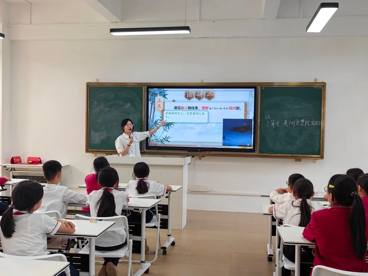 随后,课堂进入了诗词导读环节。游老师播放了一段《卜算子·黄州定慧院寓居作》的诵读视频,让同学们在视觉与听觉的双重享受中,初步领略到这首词的韵味。接着,游老师带领同学们逐字逐句地品读诗词,从“缺月挂疏桐,漏断人初静”的清冷夜景,到“谁见幽人独往来,缥缈孤鸿影”的孤独徘徊,再到“惊起却回头,有恨无人省。拣尽寒枝不肯栖,寂寞沙洲冷”的无奈与坚守,同学们在游老师的引导下,深入体会到了苏轼内心深处的情感世界。