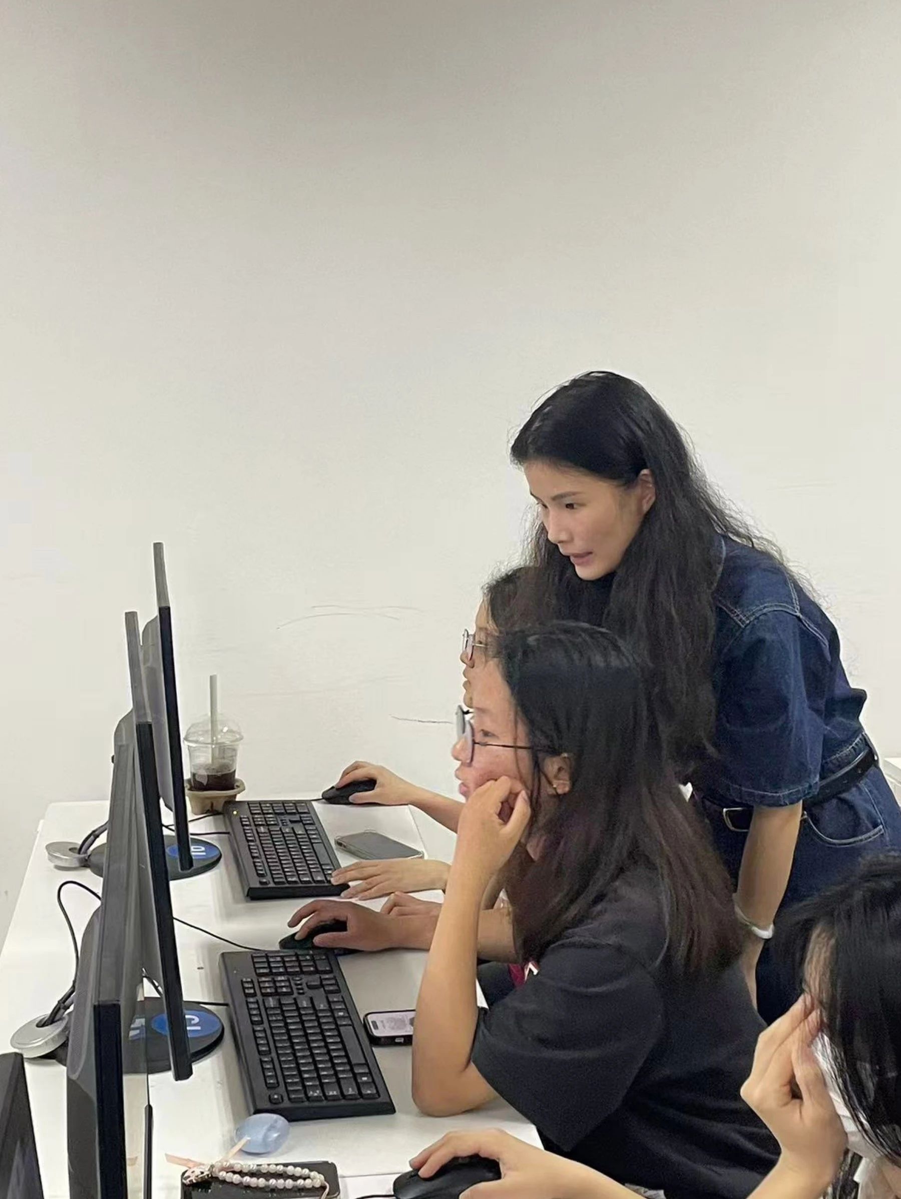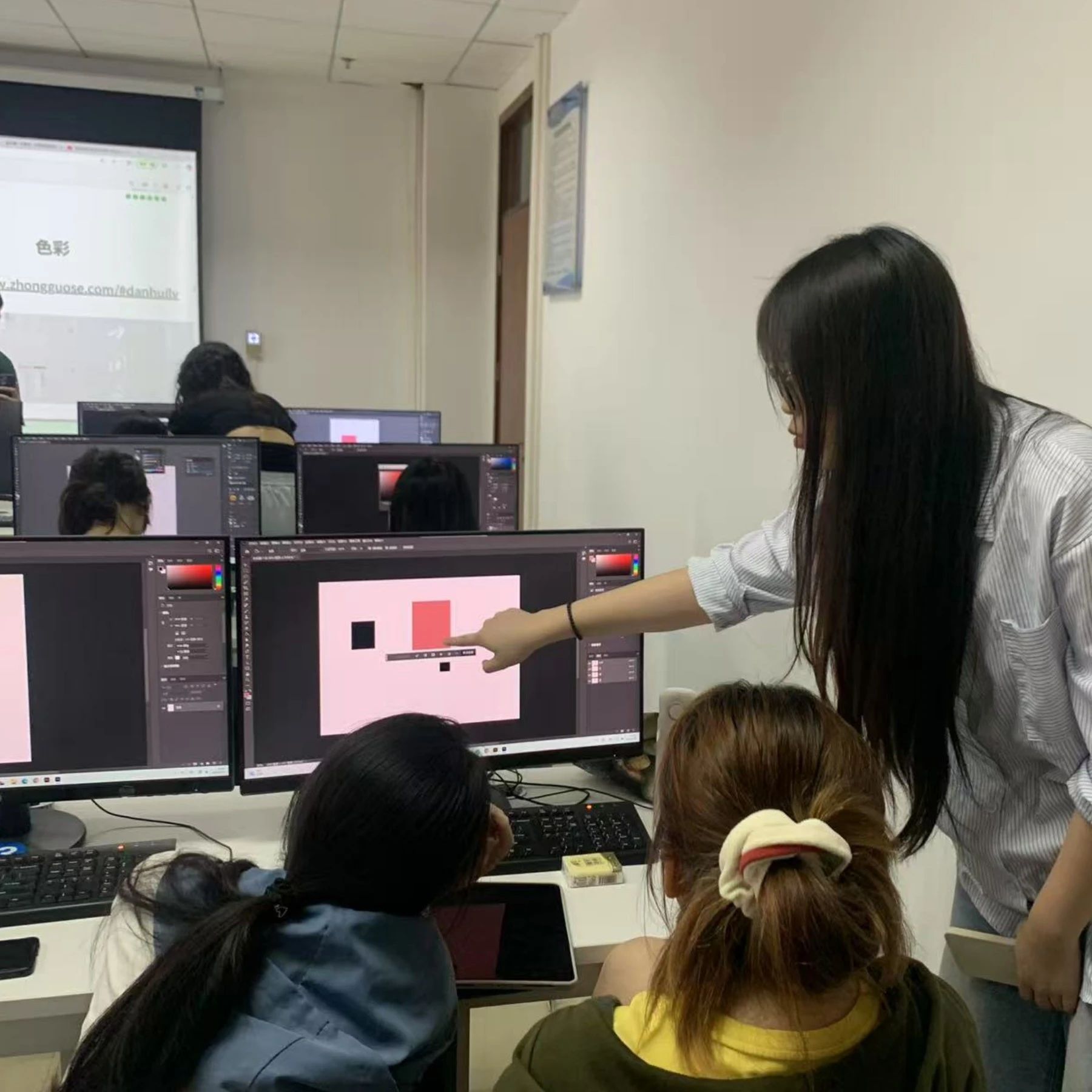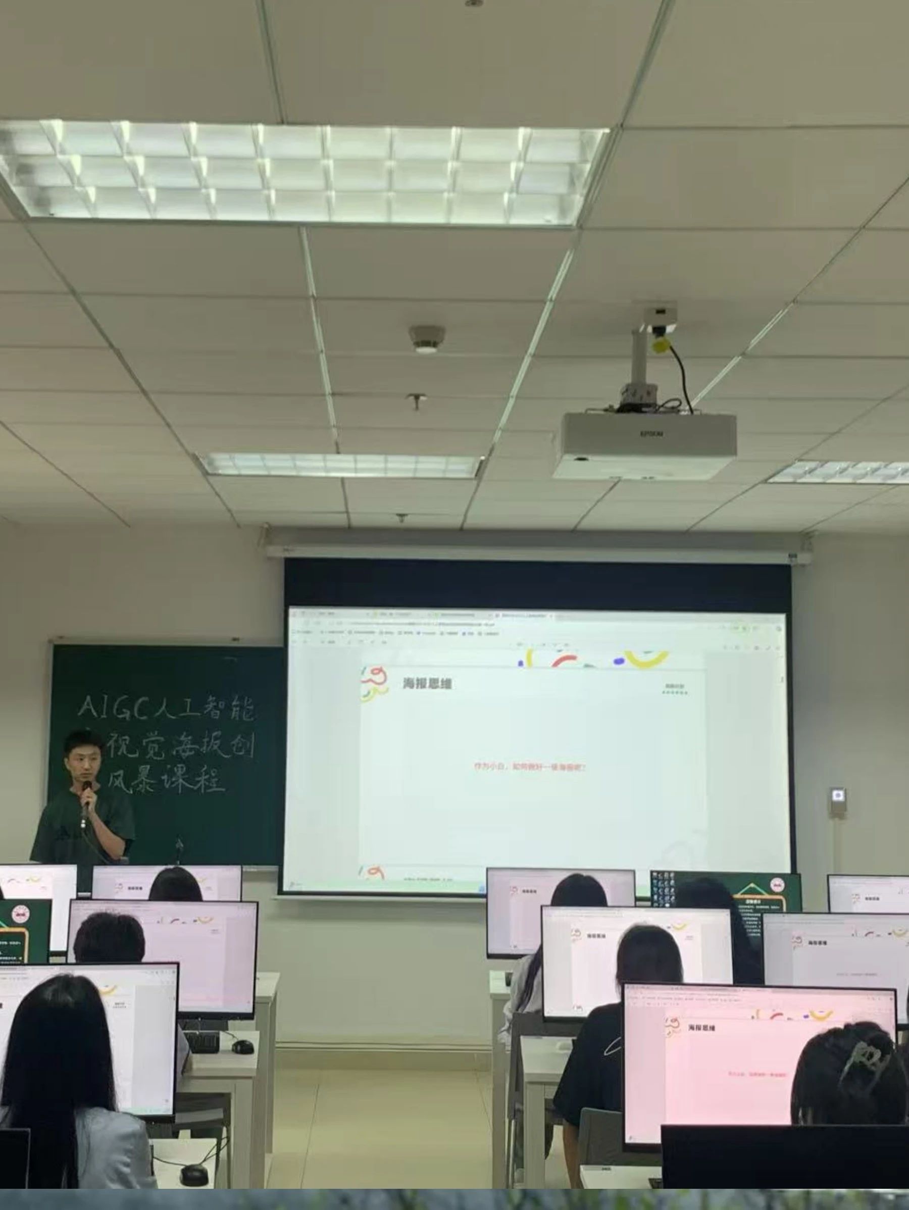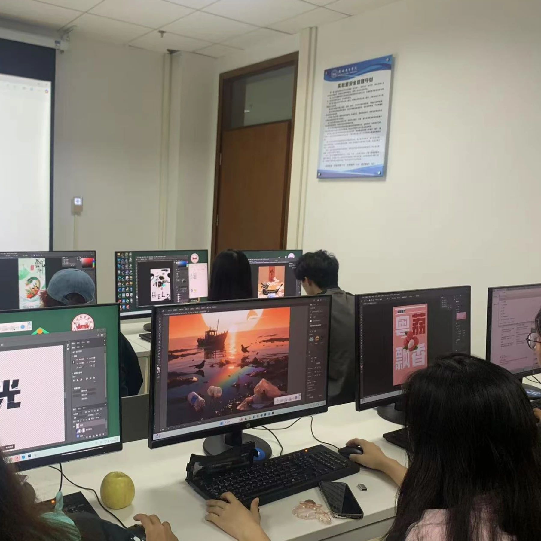 在发布了任务后,同学们着手进行海报风格设计,小老师们全员出动,一对一对各位同学进行了深入指导,对同学们的海报风格细致化,艺术字体,图片转化进行了教导。