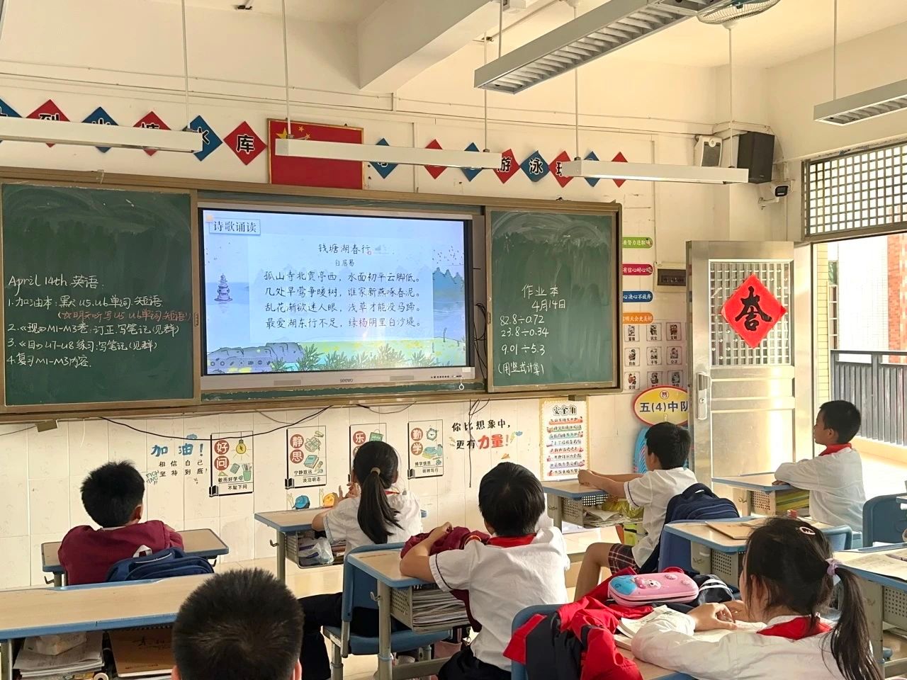 课堂伊始,小武老师带着同学们复习白居易的生平,并简要讲解了《钱塘湖春行》的创作背景。紧接着,小武老师通过播放诗歌鉴赏视频,帮助同学在理解背景的基础上感受意境之美,初读诗歌环节在朗朗读书声中结束。